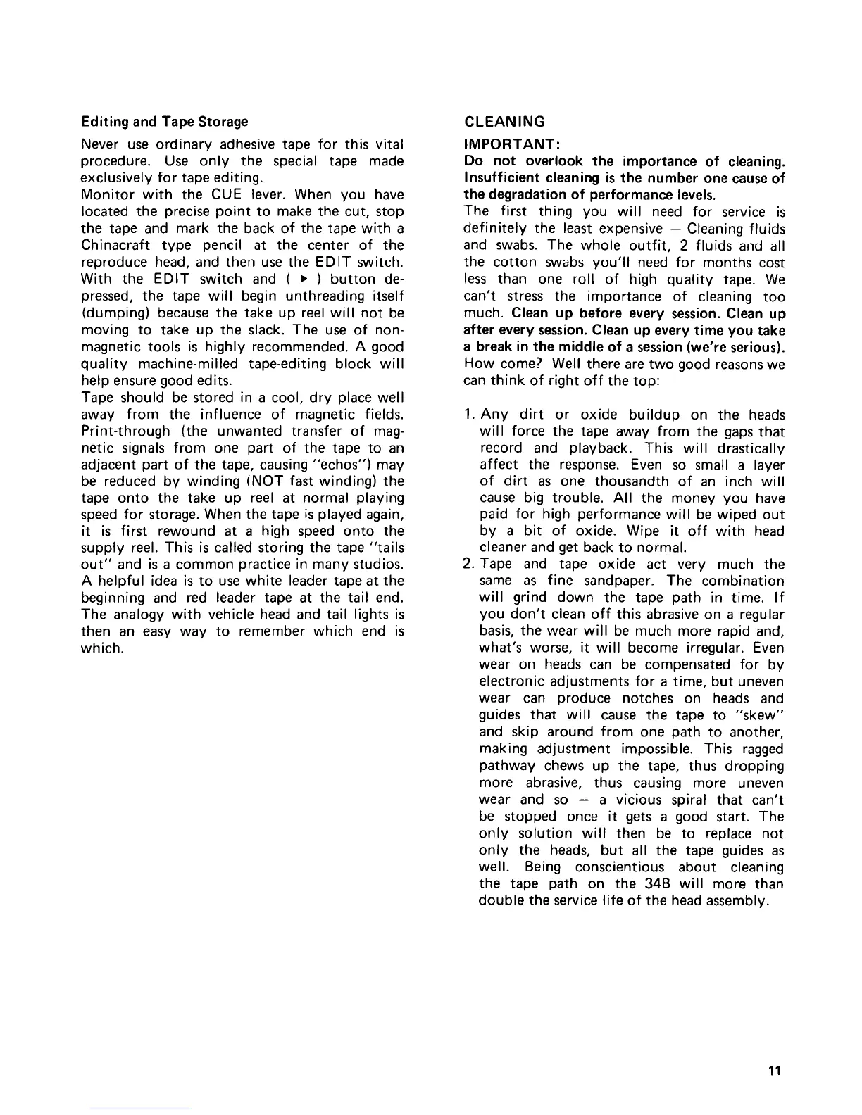 Tascam 34B - Editing and Tape Storage Best Practices; Head Cleaning and Maintenance Importance