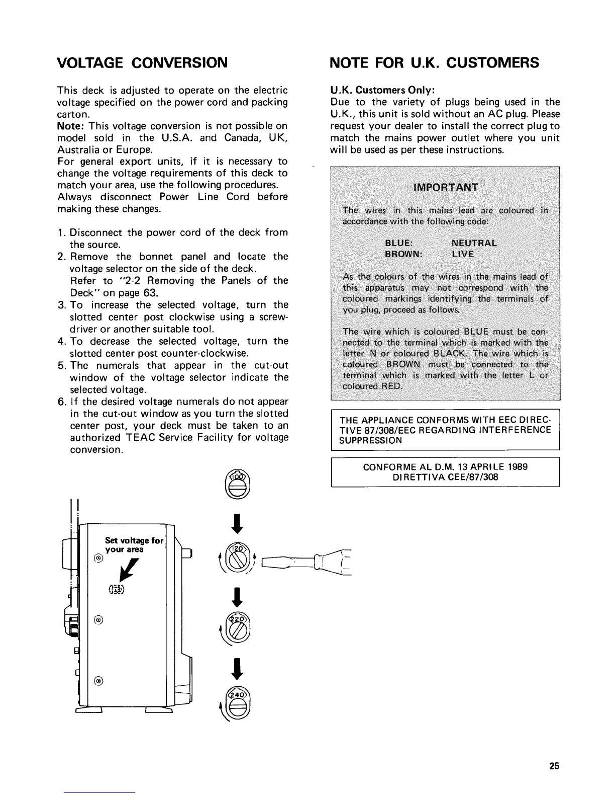 Tascam 34B - Voltage Conversion and User Notes; Procedure for Adjusting Operating Voltage; UK Plug and Interference Suppression Compliance