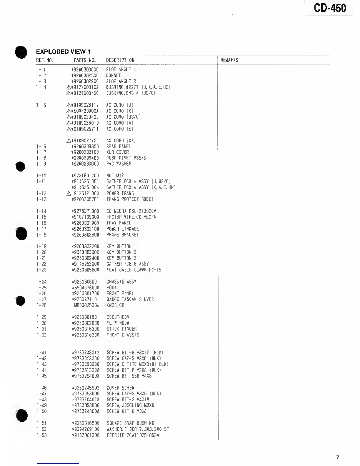 Tascam CD-450 - Exploded View 1 Parts List; Component Identification and Part Numbers