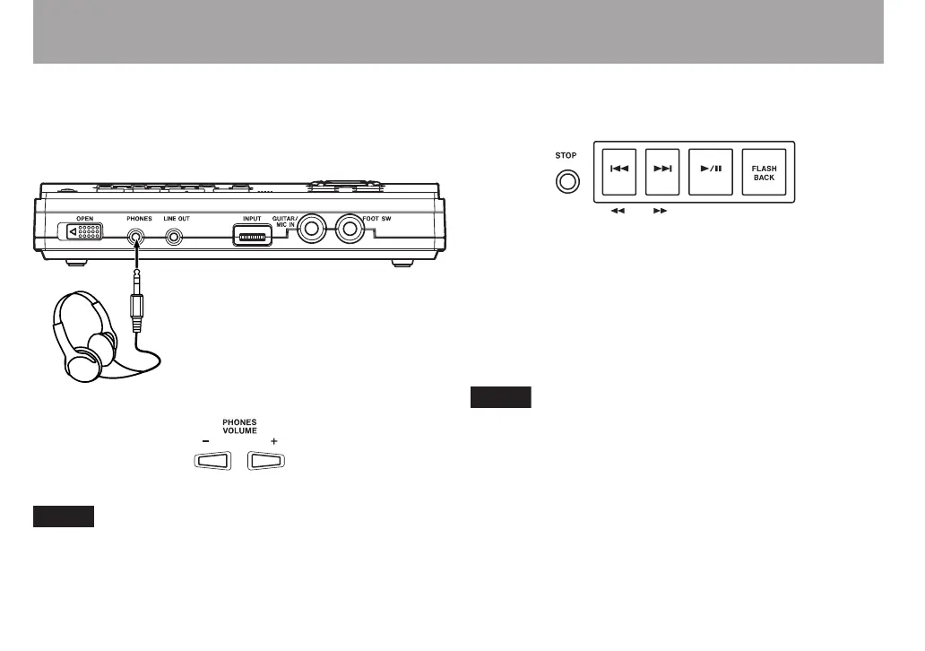 Connect headphones to the PHONES jack on the front of the