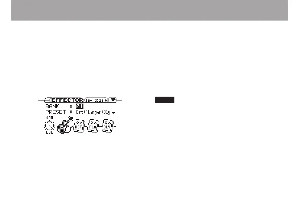 The EFFECTOR, LEVEL and TUNER screens appear as
