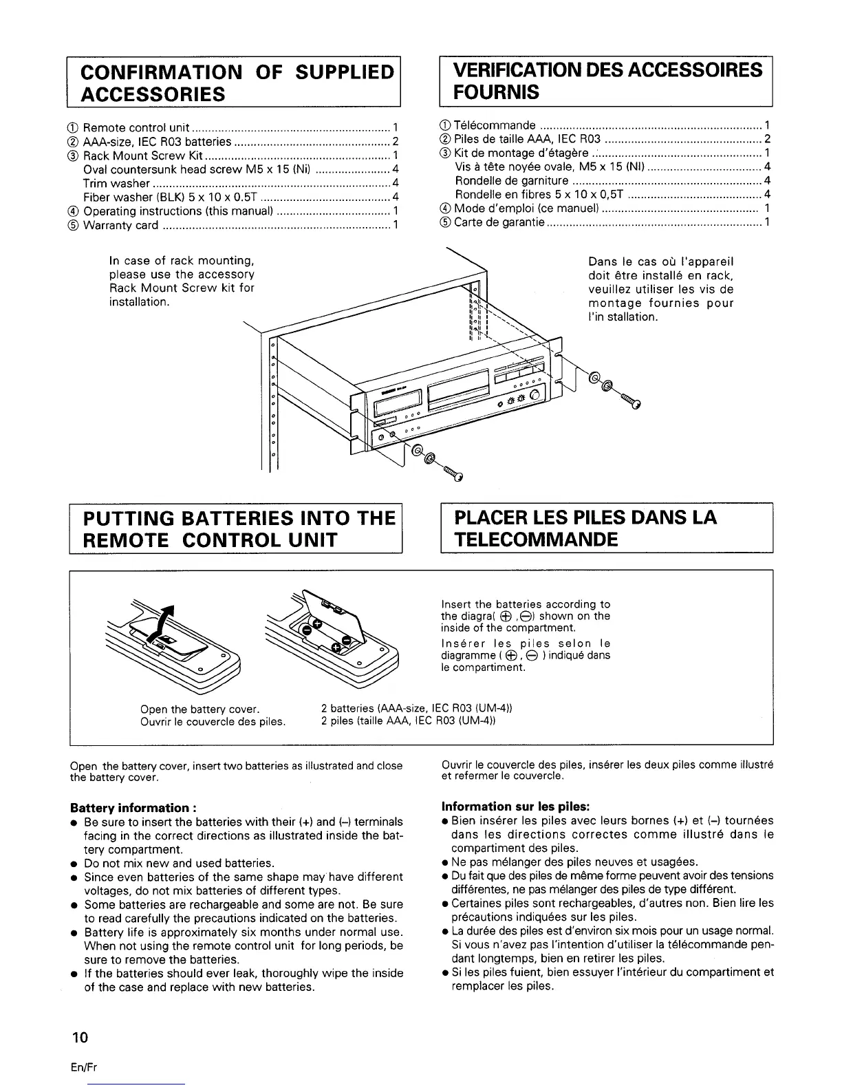 Tascam DA-20 - Confirmation of Supplied Accessories; Putting Batteries into the Remote Control Unit; Battery Information