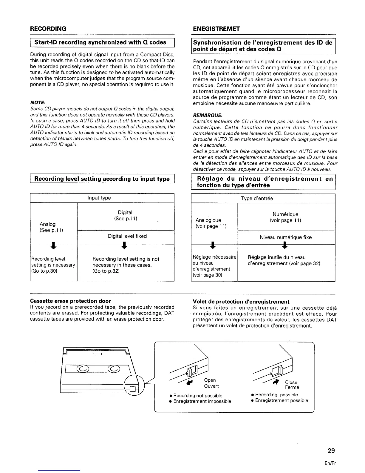 Tascam DA-20 - Start-ID Recording Synchronized with Q Codes; Recording Level Setting According to Input Type; Cassette Erase Protection Door