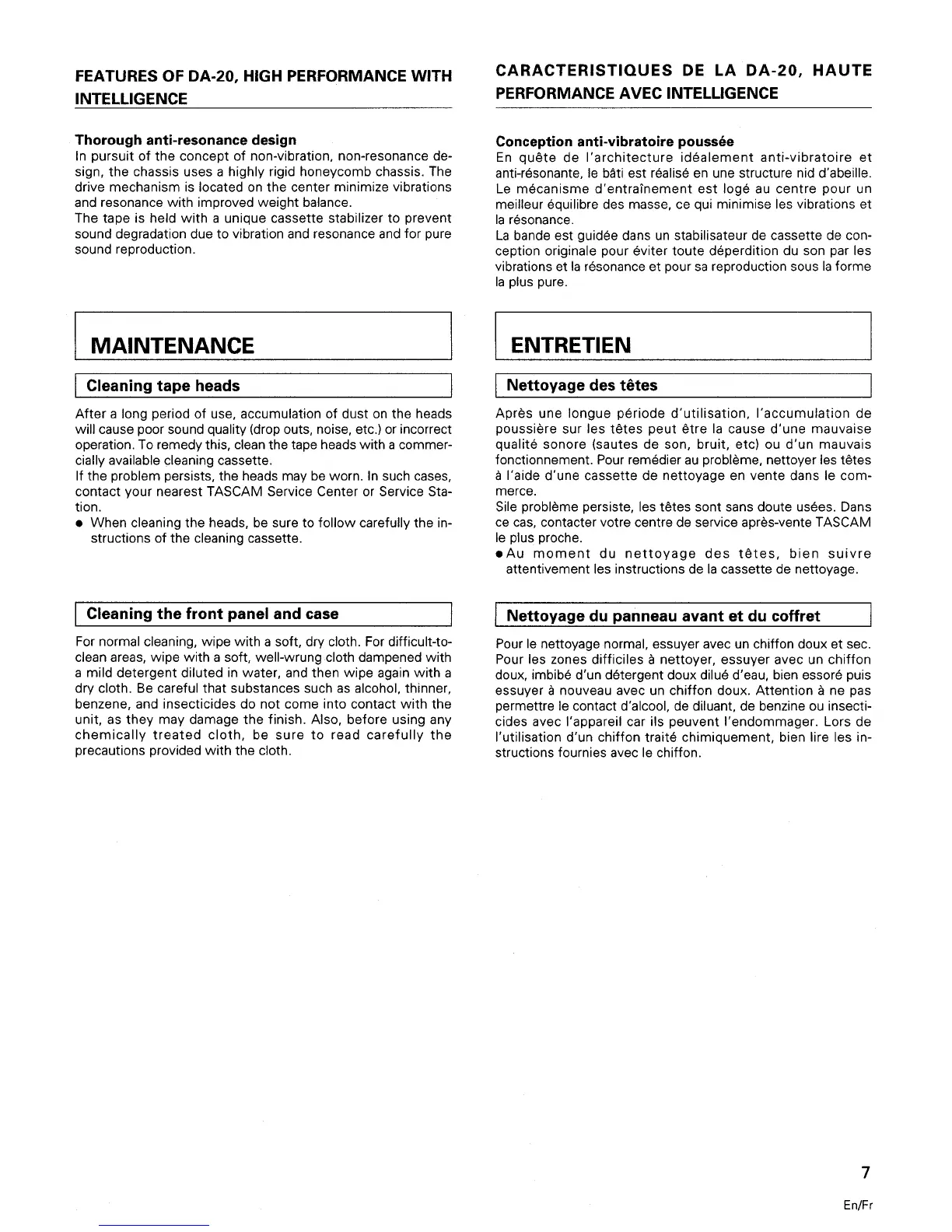 Tascam DA-20 - Anti-Resonance Design; Maintenance; Cleaning Tape Heads; Cleaning Exterior Surfaces
