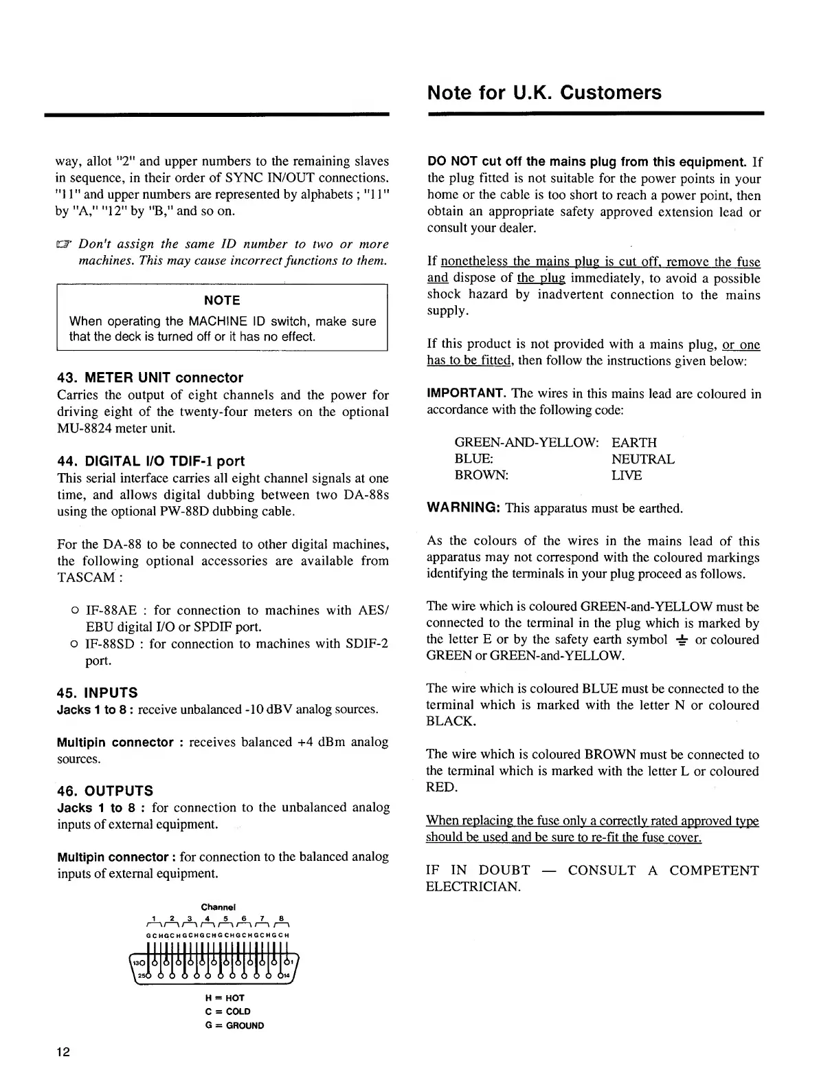 Tascam DA-88 - Note for U.K. Customers
