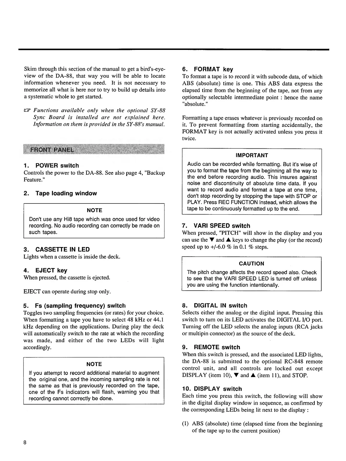 Tascam DA-88 - Front Panel Controls
