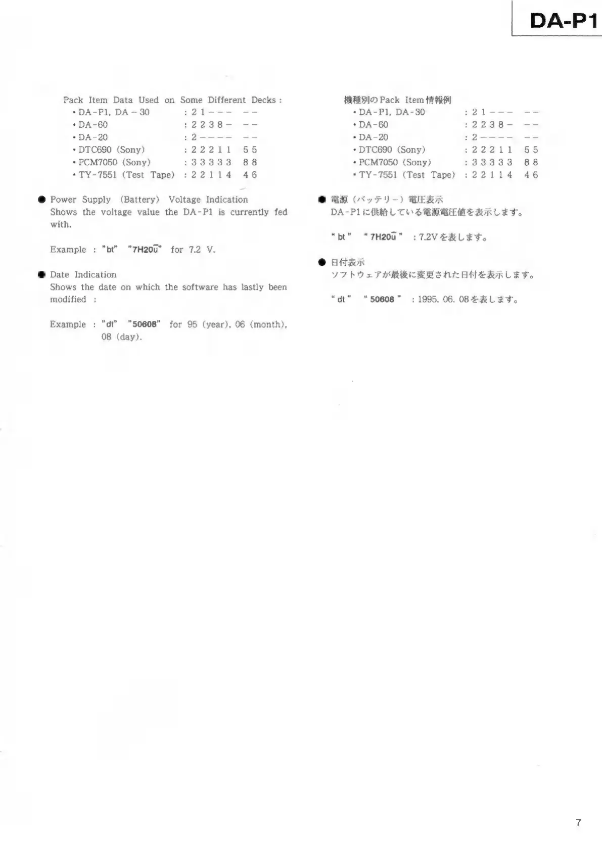 Tascam DA-P1 - Pack Item Data Examples; Pack Item Data by Deck Model; Power Supply Voltage Indication; Software Date Indication