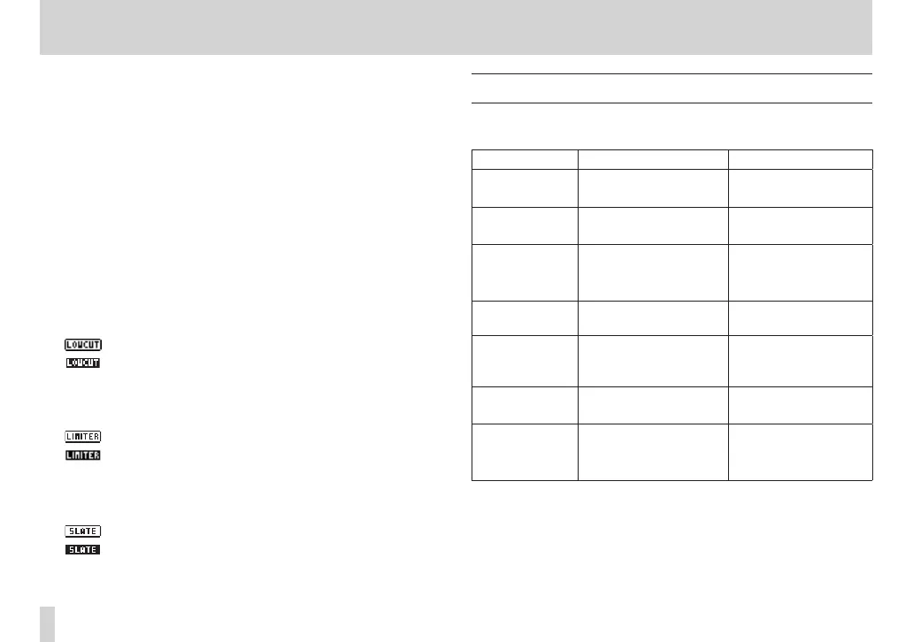 This shows whether the low cut filter is ON/OFF. (See “Using the