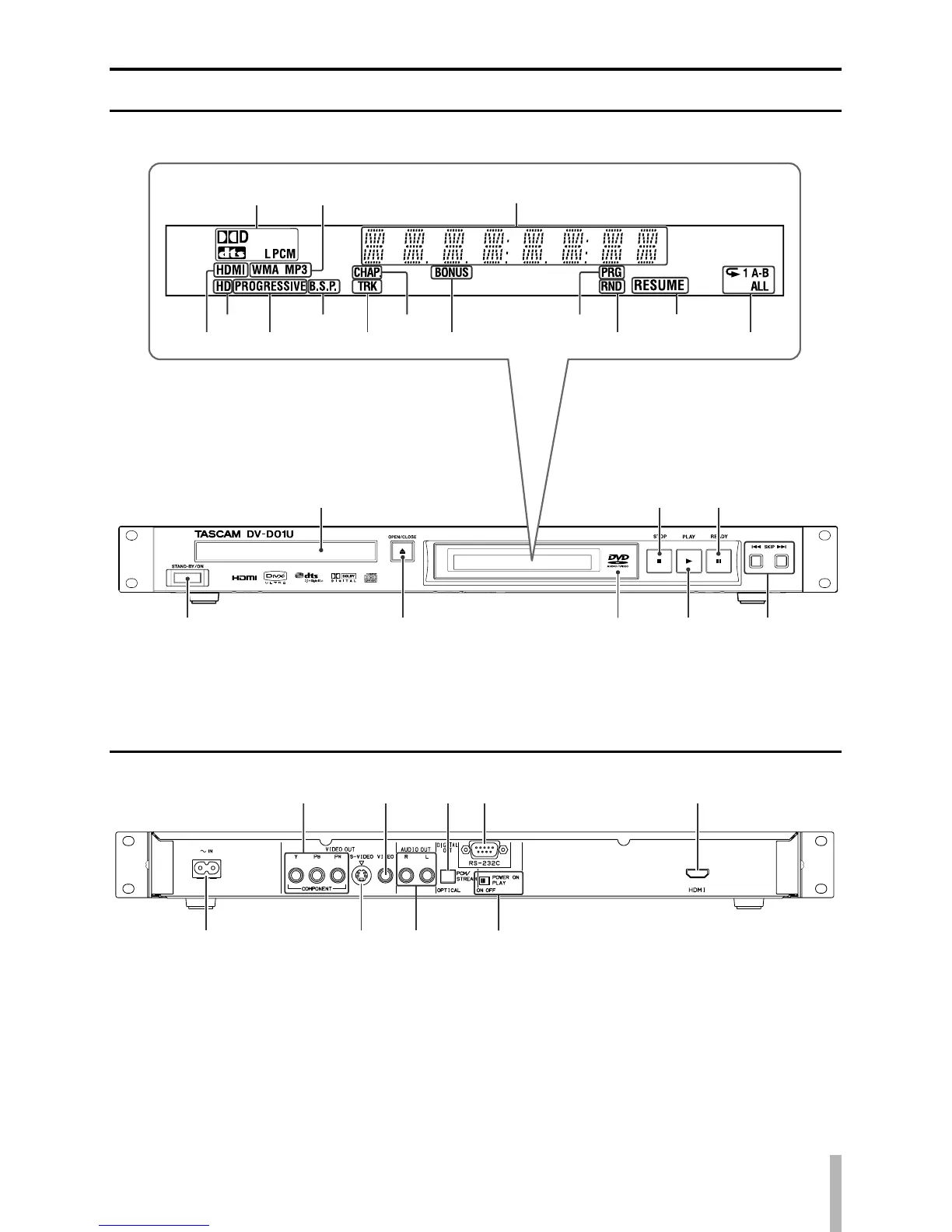 Tascam DV-D01U - Description of parts and controls; Front panel; Rear panel