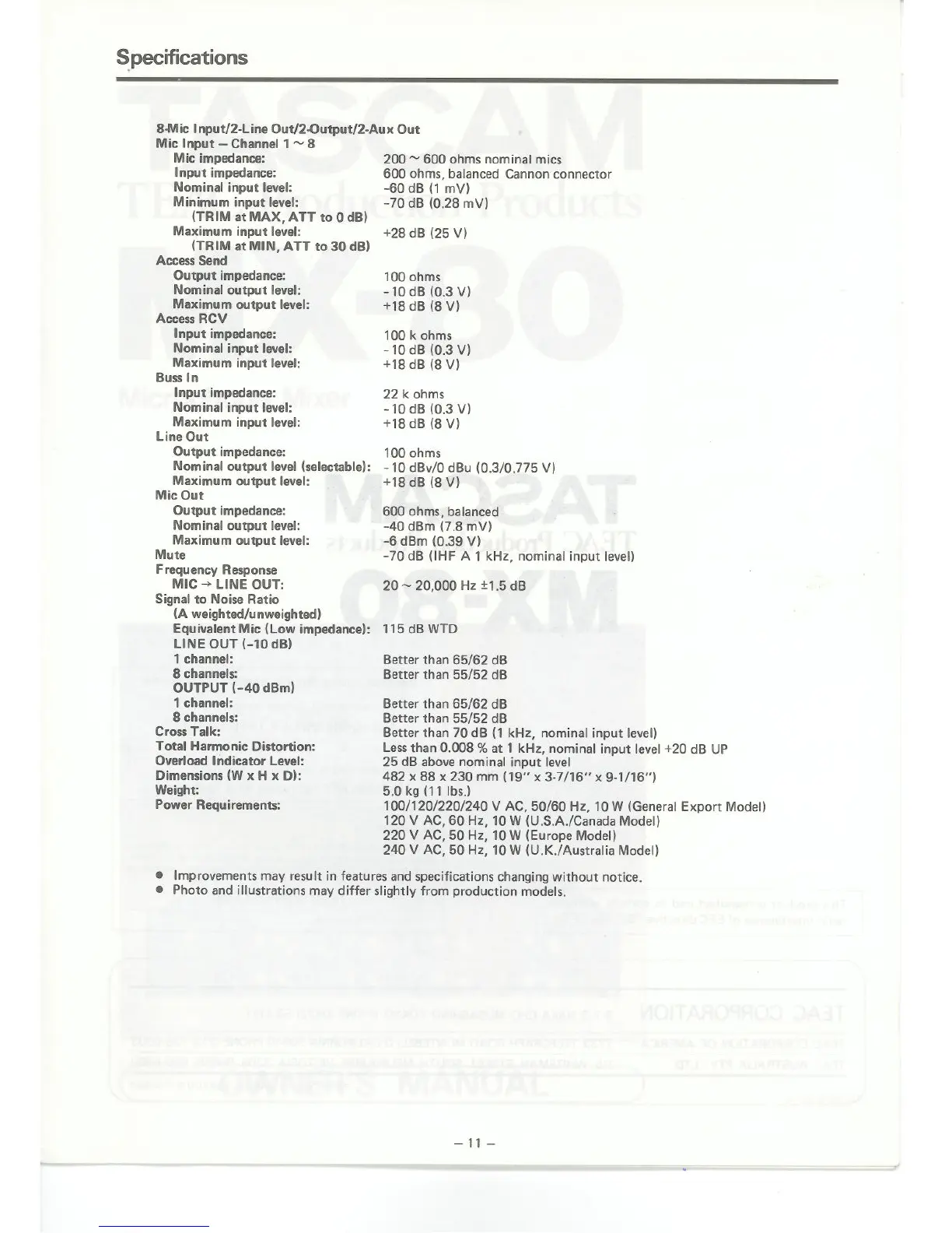 Tascam MX-80 - Specifications; Input;Output Specifications; Performance Specifications; Physical and Power Specifications