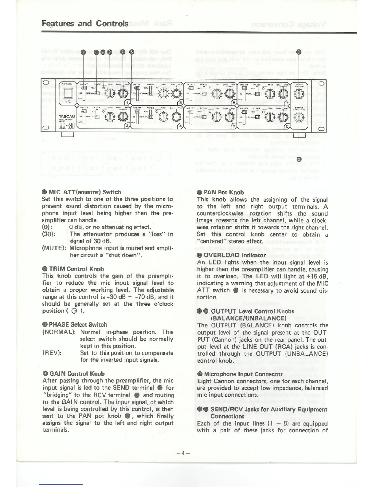 Tascam MX-80 - Features and Controls; MIC ATT (enuator) Switch; TRIM Control Knob; PHASE Select Switch