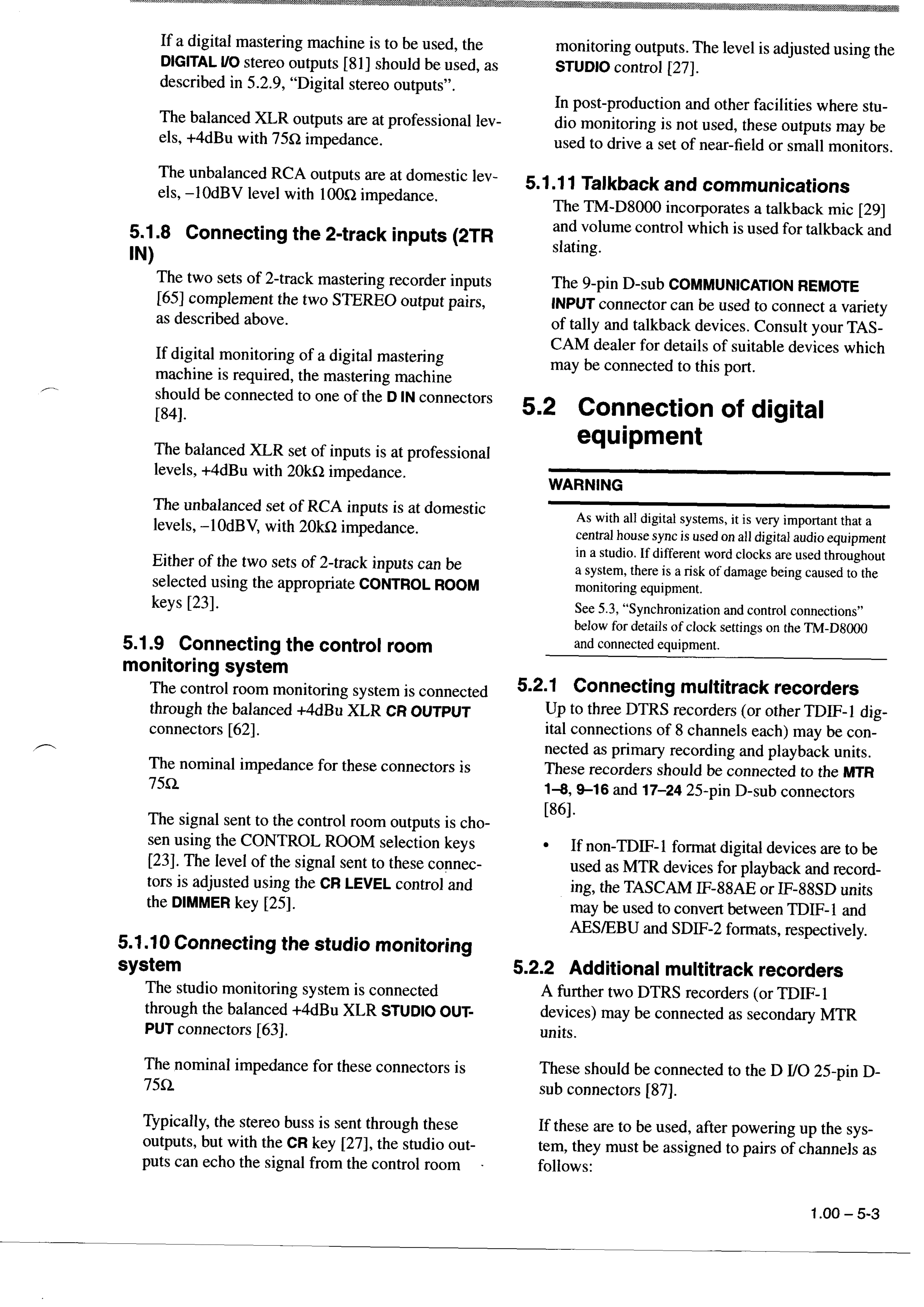 Tascam TM-D8000 - 5.2.1 Connecting multitrack recorders; 5.2 Connection of digital equipment
