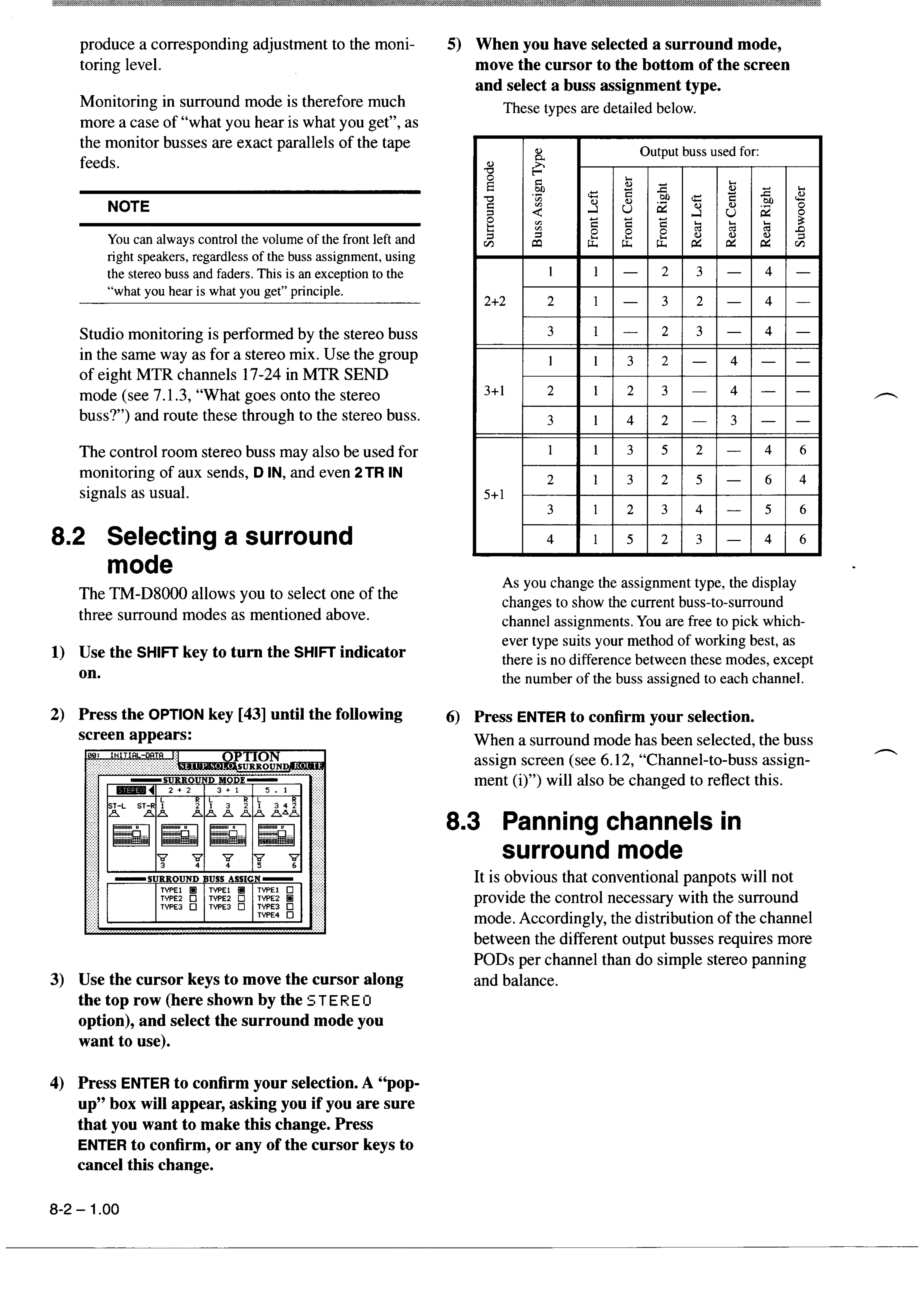 Tascam TM-D8000 - 8.2 Selecting a surround mode; 8.3 Panning channels in surround mode