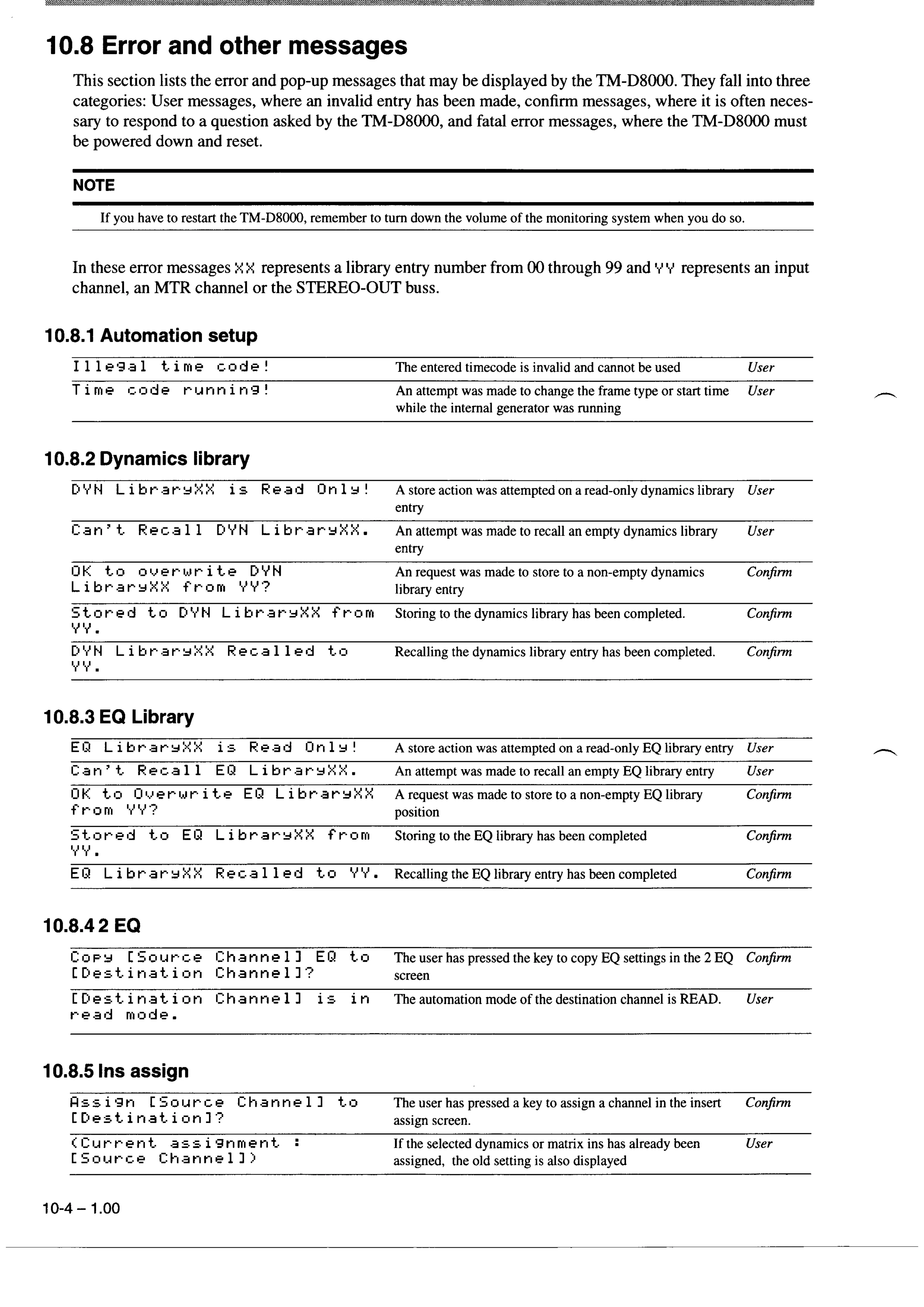 Tascam TM-D8000 - 10.8 Error and other messages