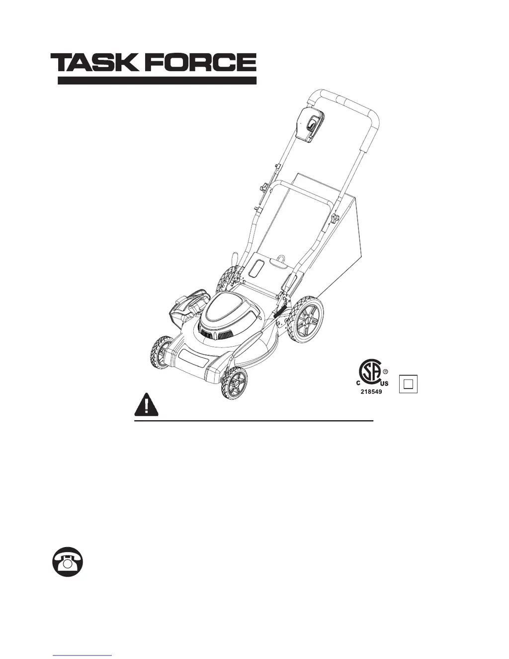 If your Task Force Lawn Mower isn't starting, first ensure the extension cord is securely connected to both the mower plug and a working 120 V AC 60 Hz power outlet. Use the cord restraint to keep the cord close to the motor/blade control. If it still doesn't start, the motor/blade control switch may be defective and require replacement.