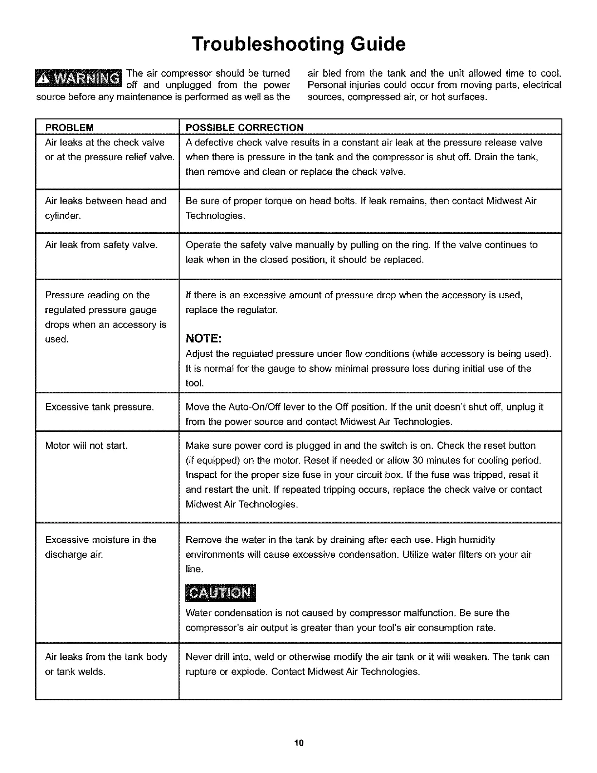 or at the pressure relief valve, when there is pressure in the tank and the compressor is shut off. Drain the tank,