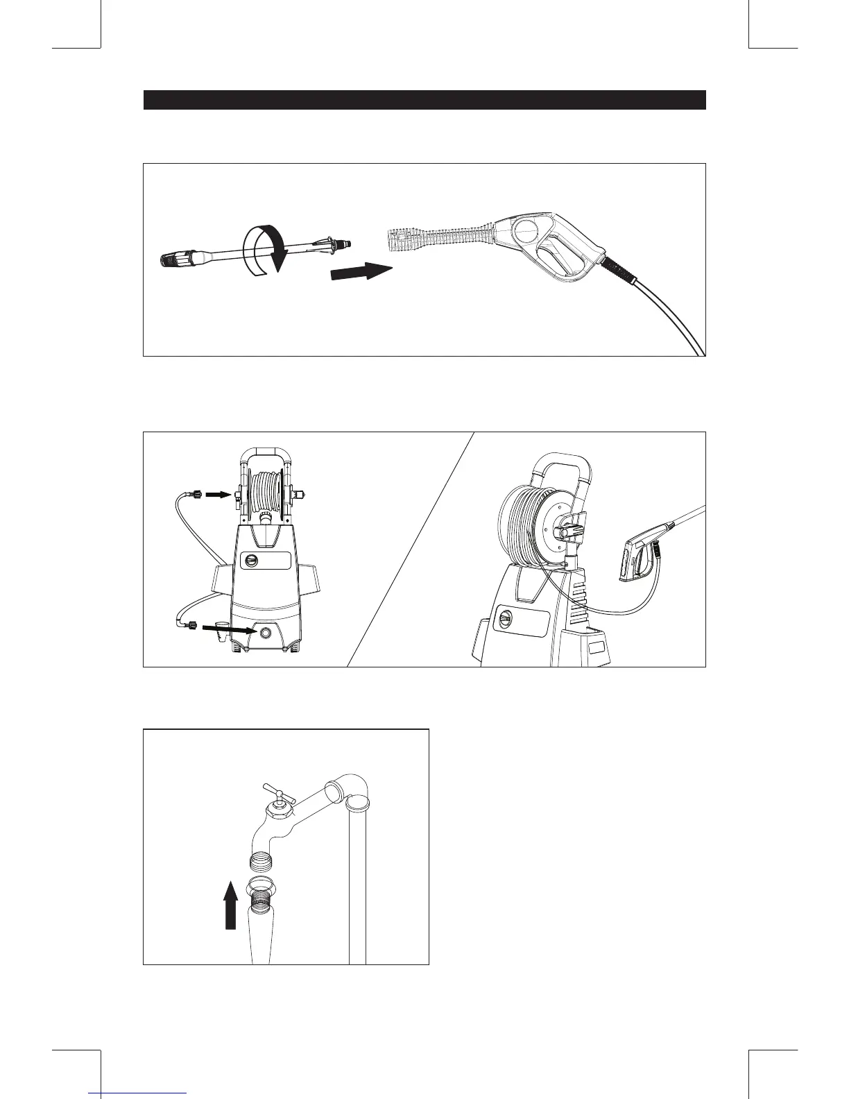 hose reel (H). Fasten the extension hose (I) tightly onto the gun assembly (C) and tighten to avoid leakage.