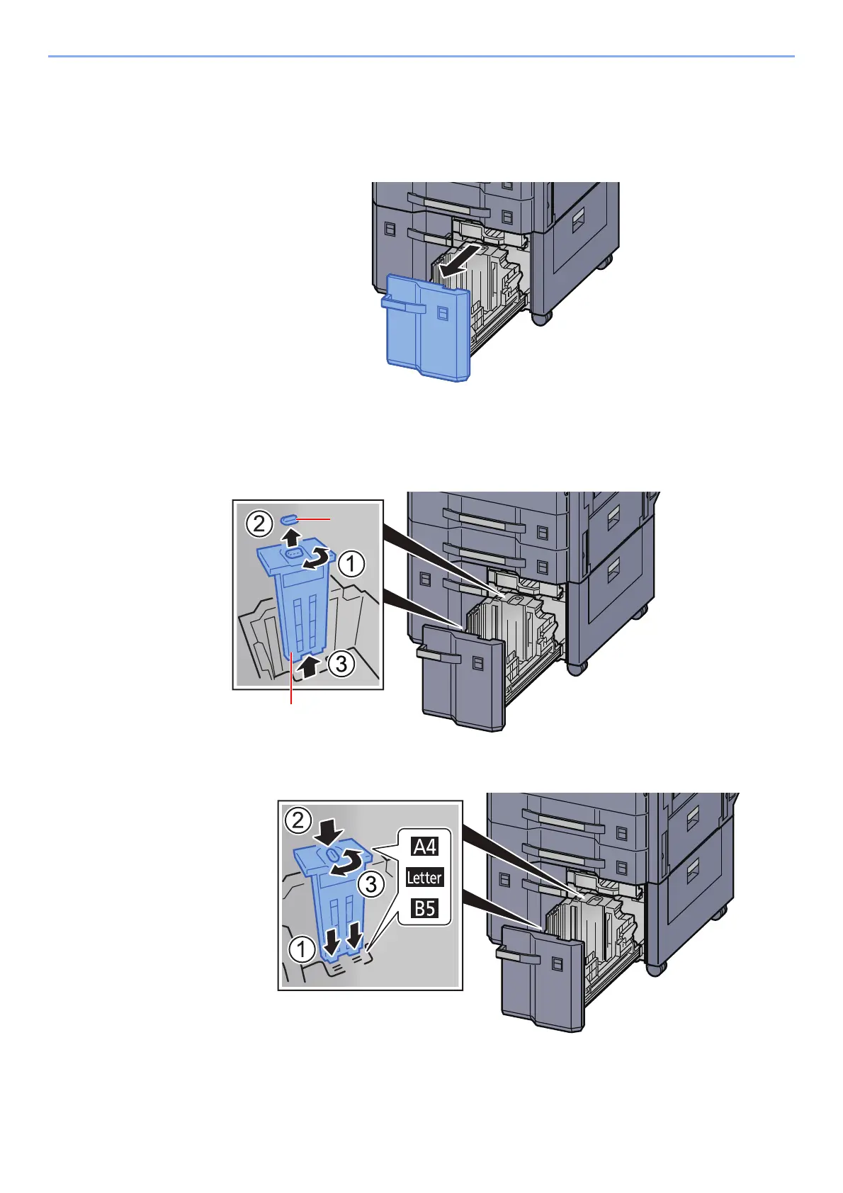 1 Rotate the Paper Size Guide (A) clamp and remove. Pull the Paper Size Guide (A) up and