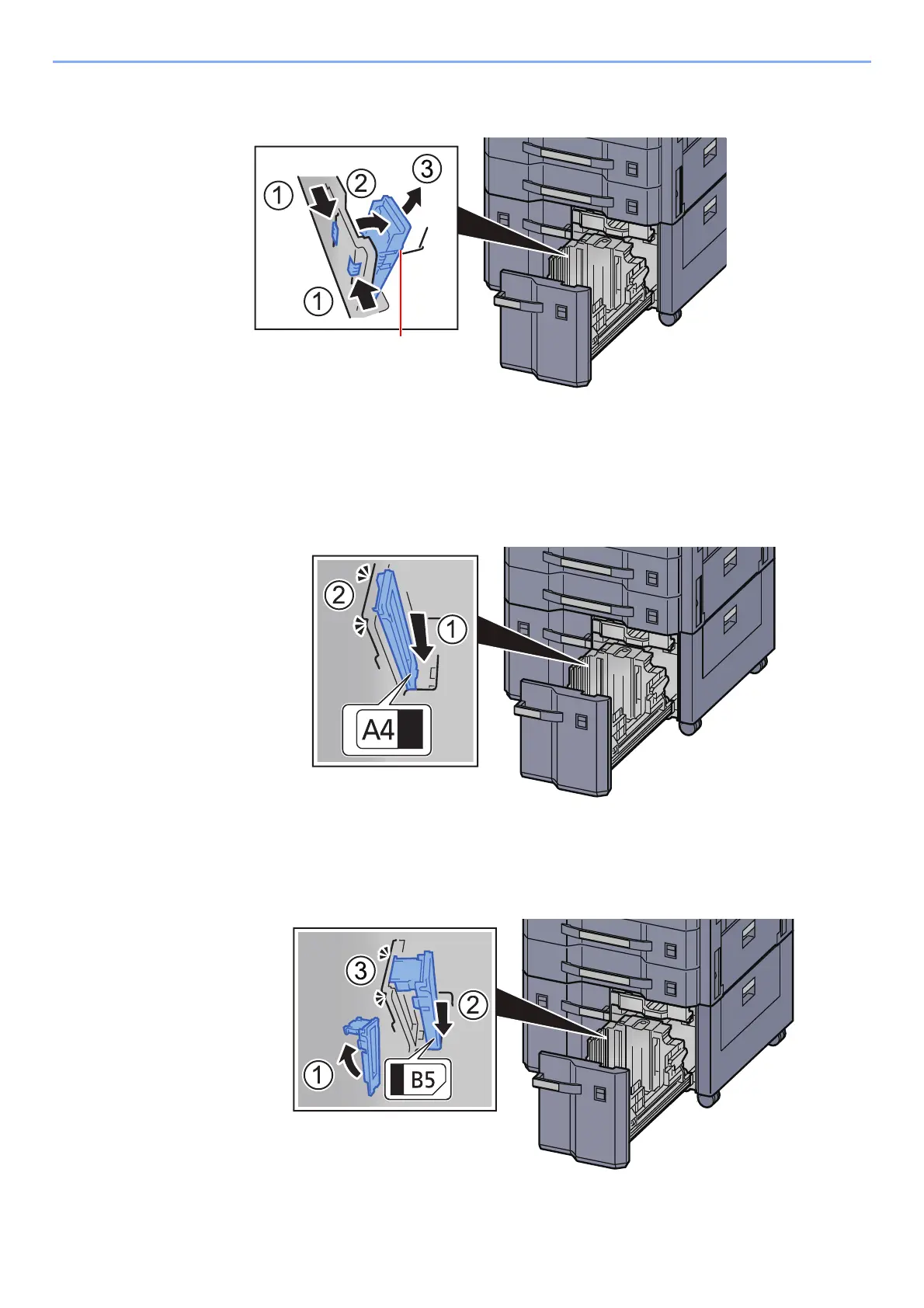Open the Paper Size Guide (B) as shown, insert into the slot marked B5 (on the bottom of the