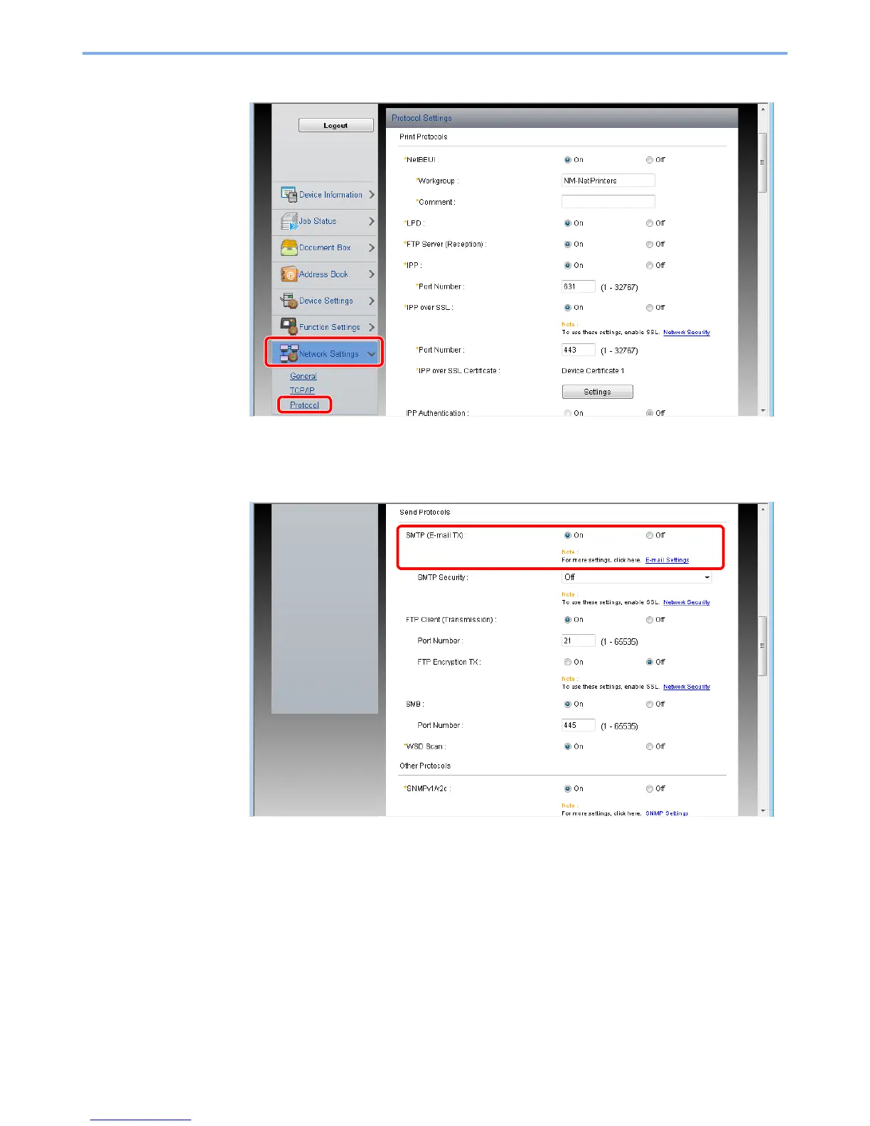 Set "SMTP (E-mail TX)" to [On] in the "Send Protocols".