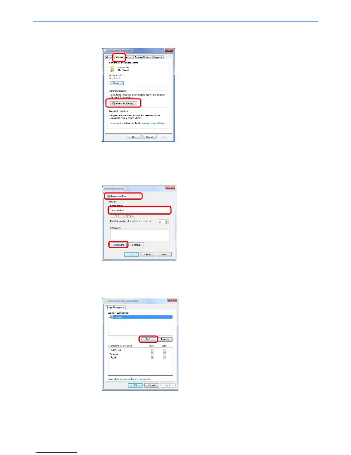 2 Right-click the "scannerdata" folder and click [Share] and [Advanced sharing]. Click