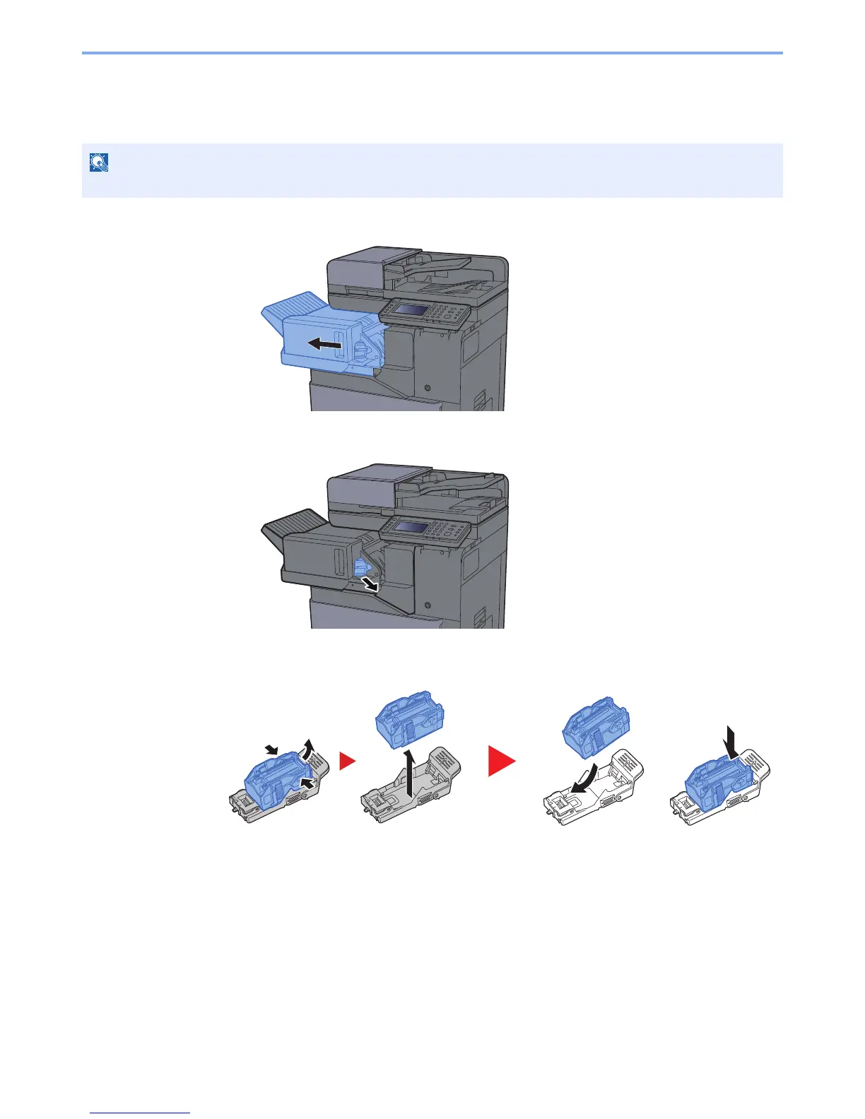 When the touch panel shows "Staple is empty.", the staple cartridge holder need to be replenished with staples.