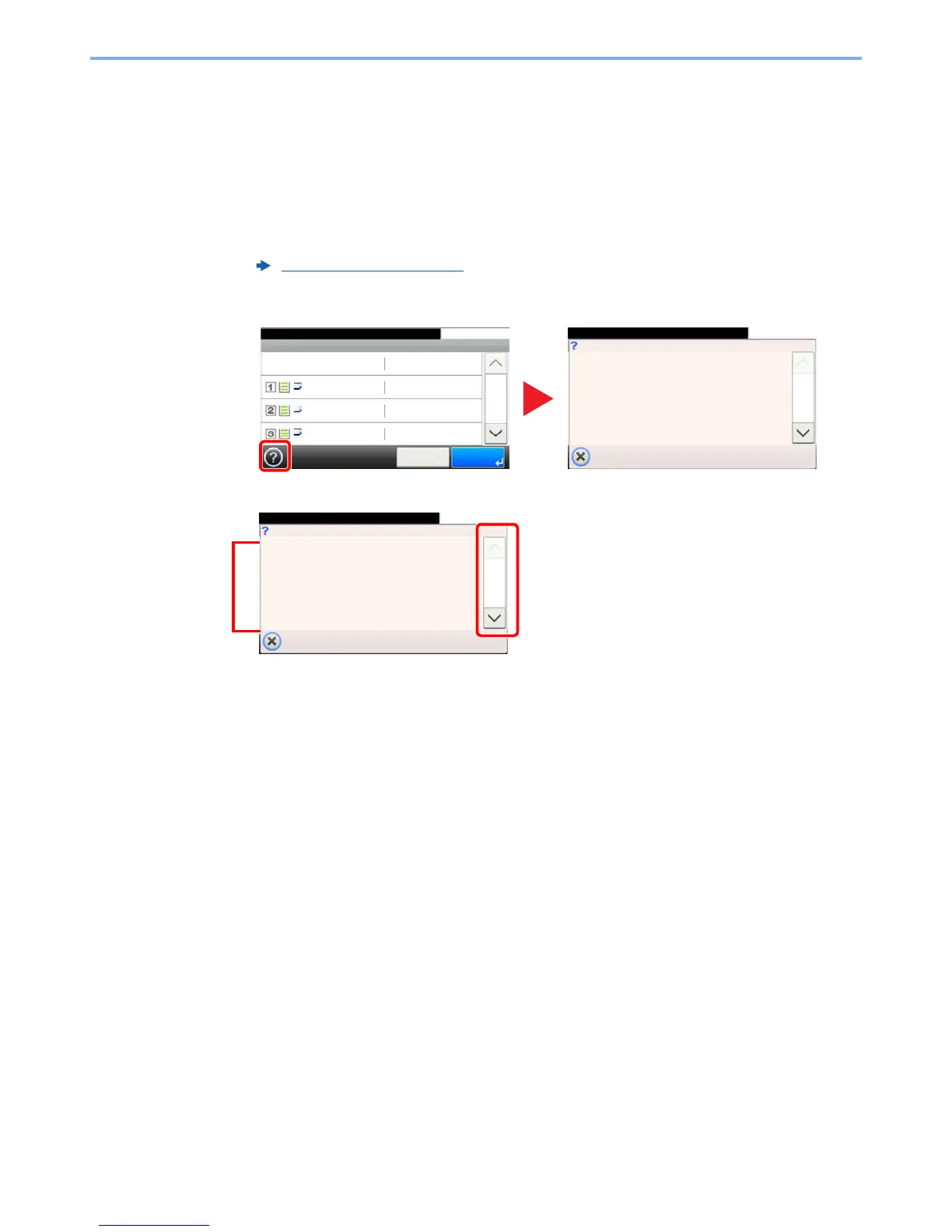 When the [?] (help) is displayed on the touch panel, you can select it to display the Help screen. The Help screen shows