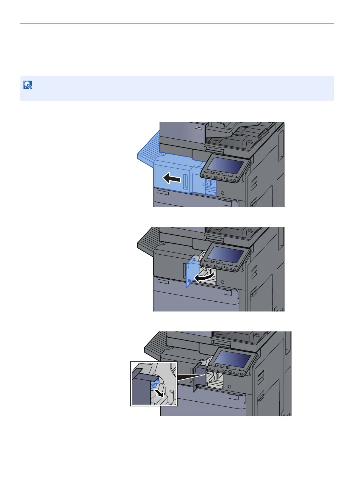 When the Staple Unit runs out of staples, the following messages will be displayed. The staple cartridge holder need to