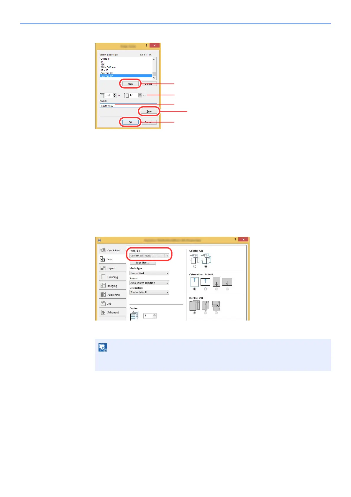 2 Enter the length (470.1 mm (18.51") or longer), and width of the custom paper size being
