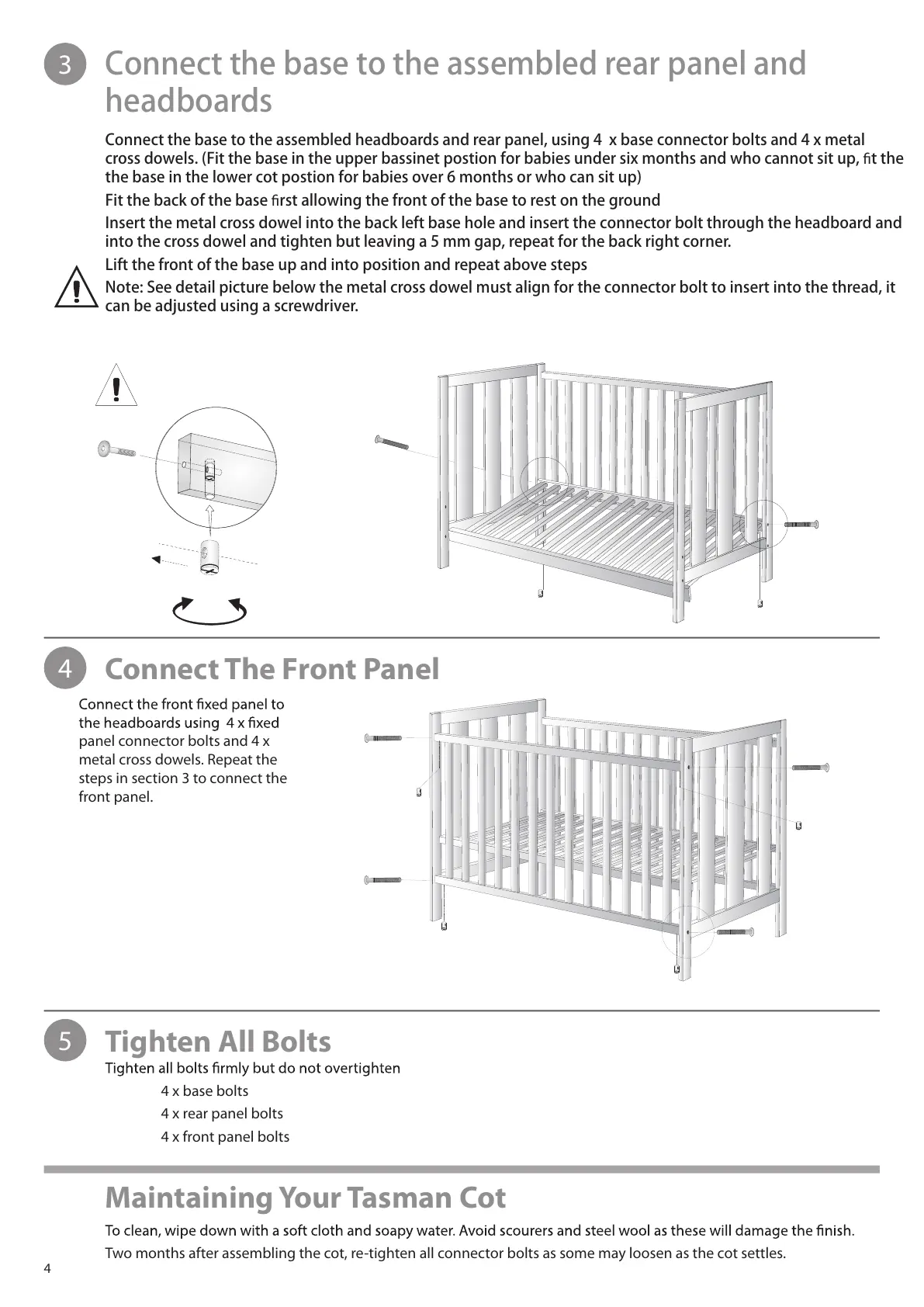 Two months after assembling the cot, re-tighten all connector bolts as some may loosen as the cot settles.