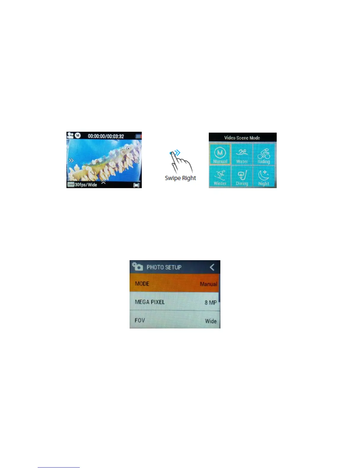 To set different scene mode, Manual, Water, Riding, Winter, Diving, Night.