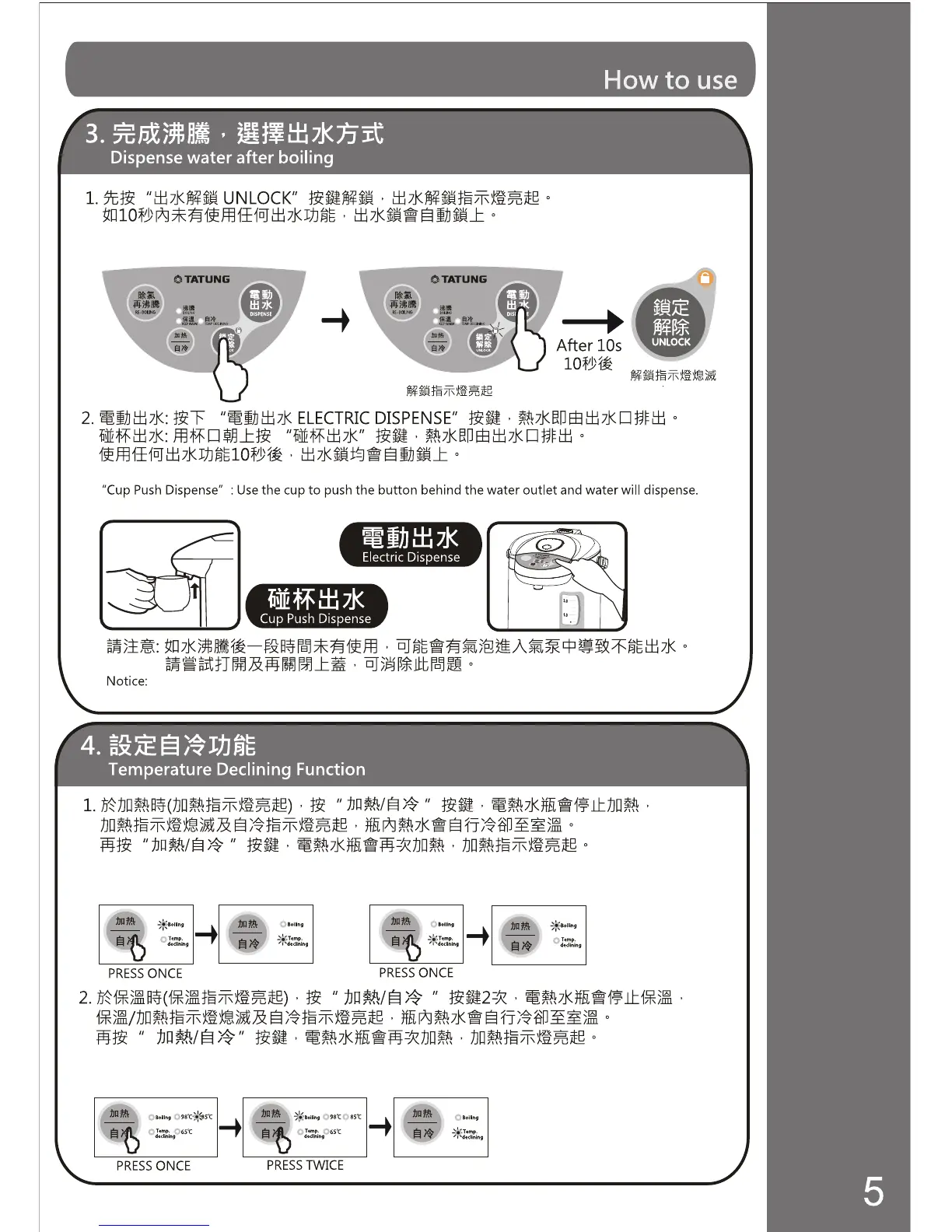off and temp declining indicator on.The water in inner pot will cool down to room temperature automatically. Press"BOILING