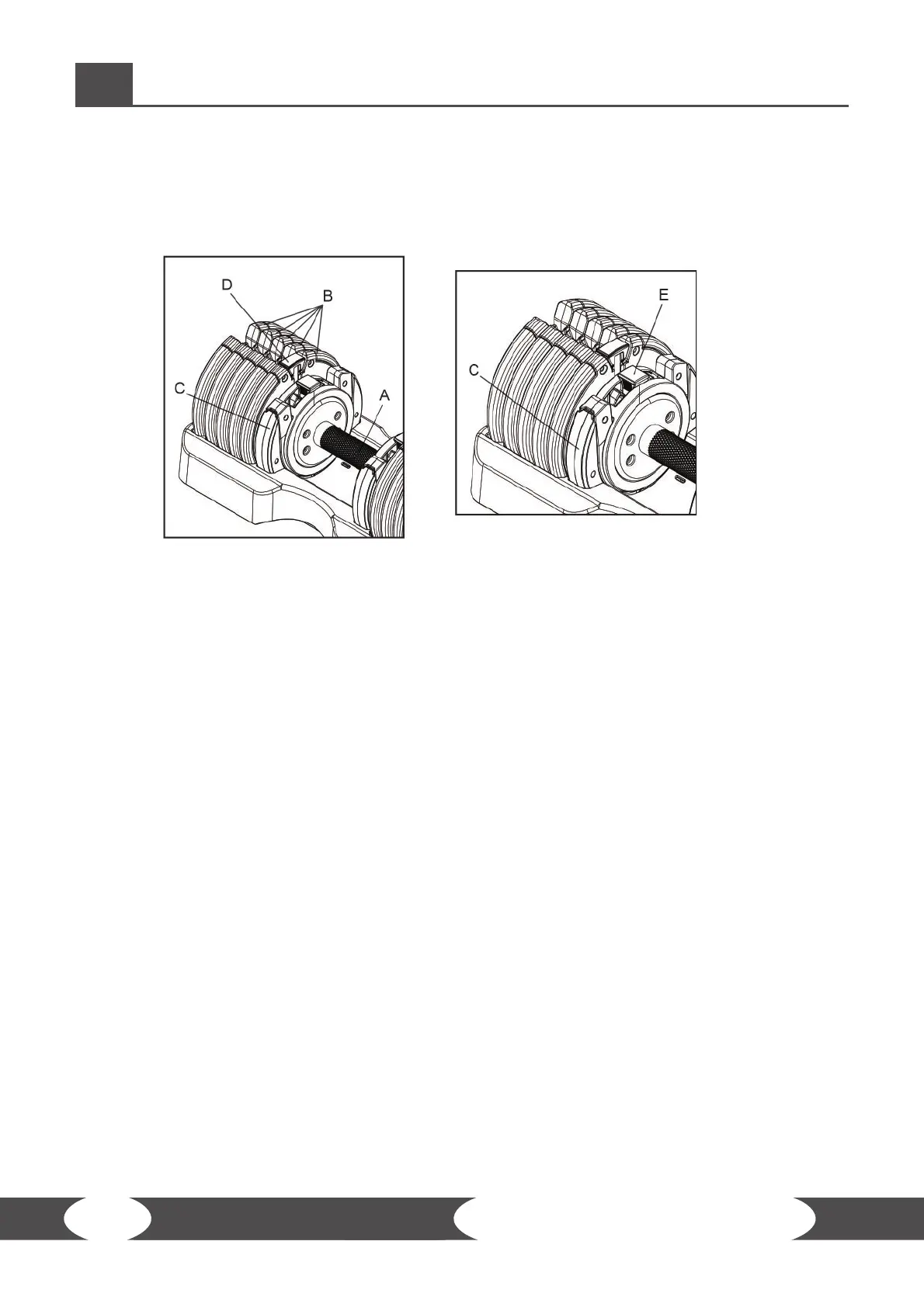 To select the required inner weight plate (C), pull the adjusting pin (E) upwards, slide it left or right in