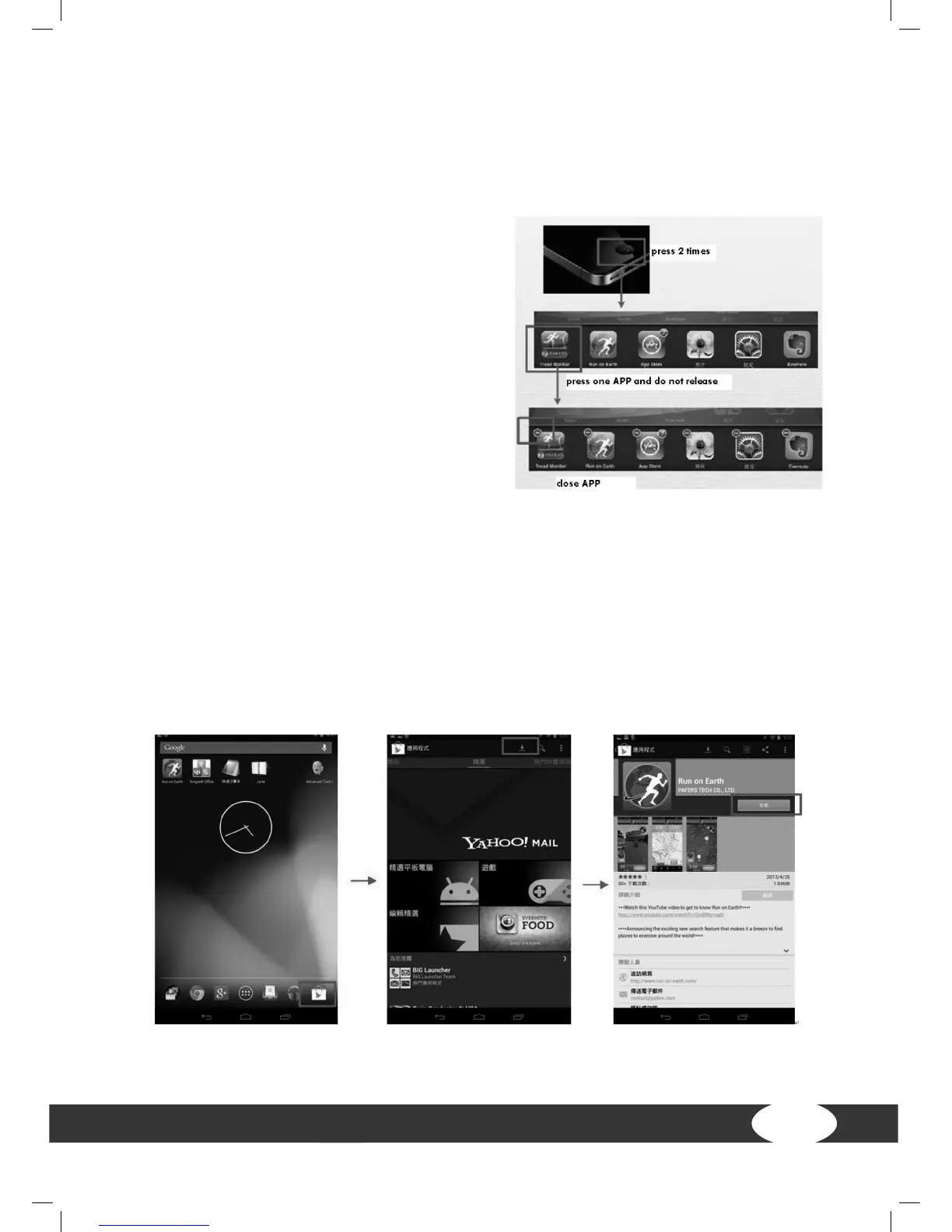 the APP manual and download the APP, which has a treadmill function, e. g., “Tread