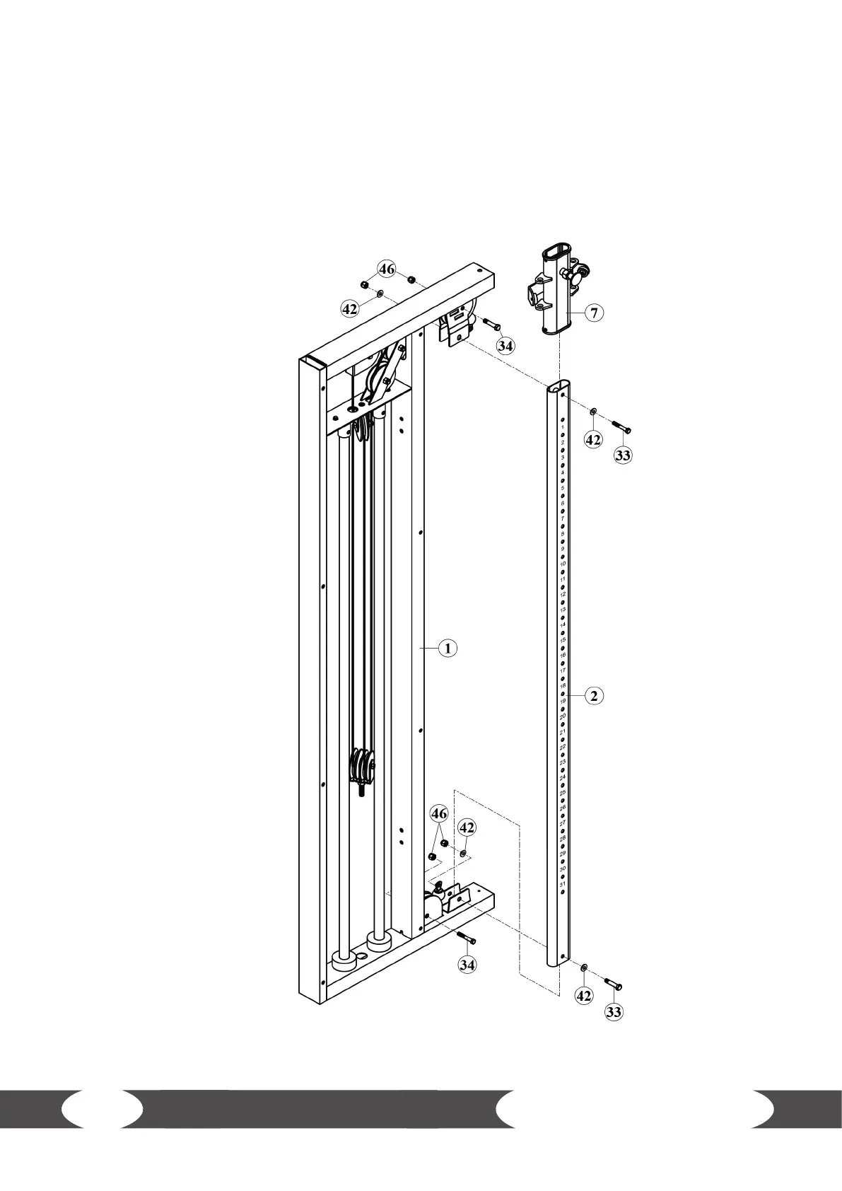 2. Reattach the upright frame (2) along with the cable height adjuster (7) to the main frame (1)