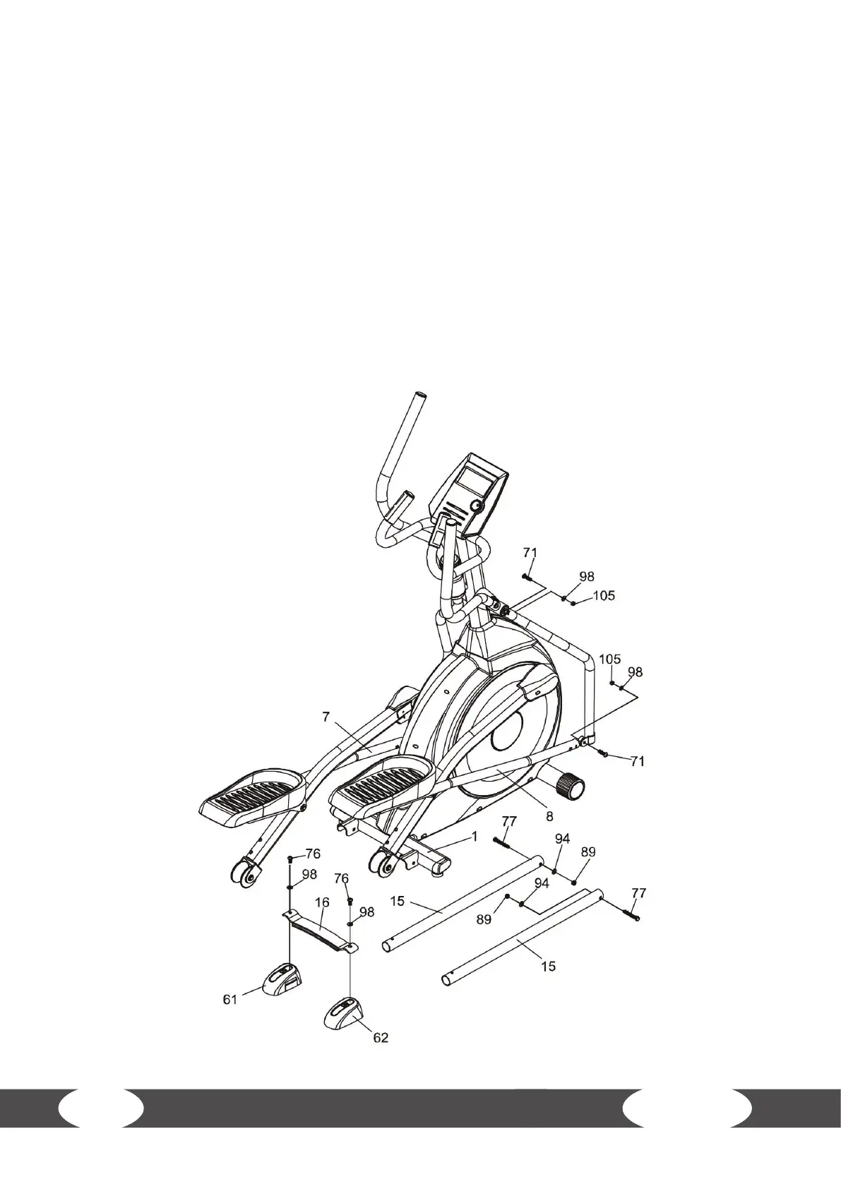 5. Mount the rails (15) with two screws (76) and two washers (98).