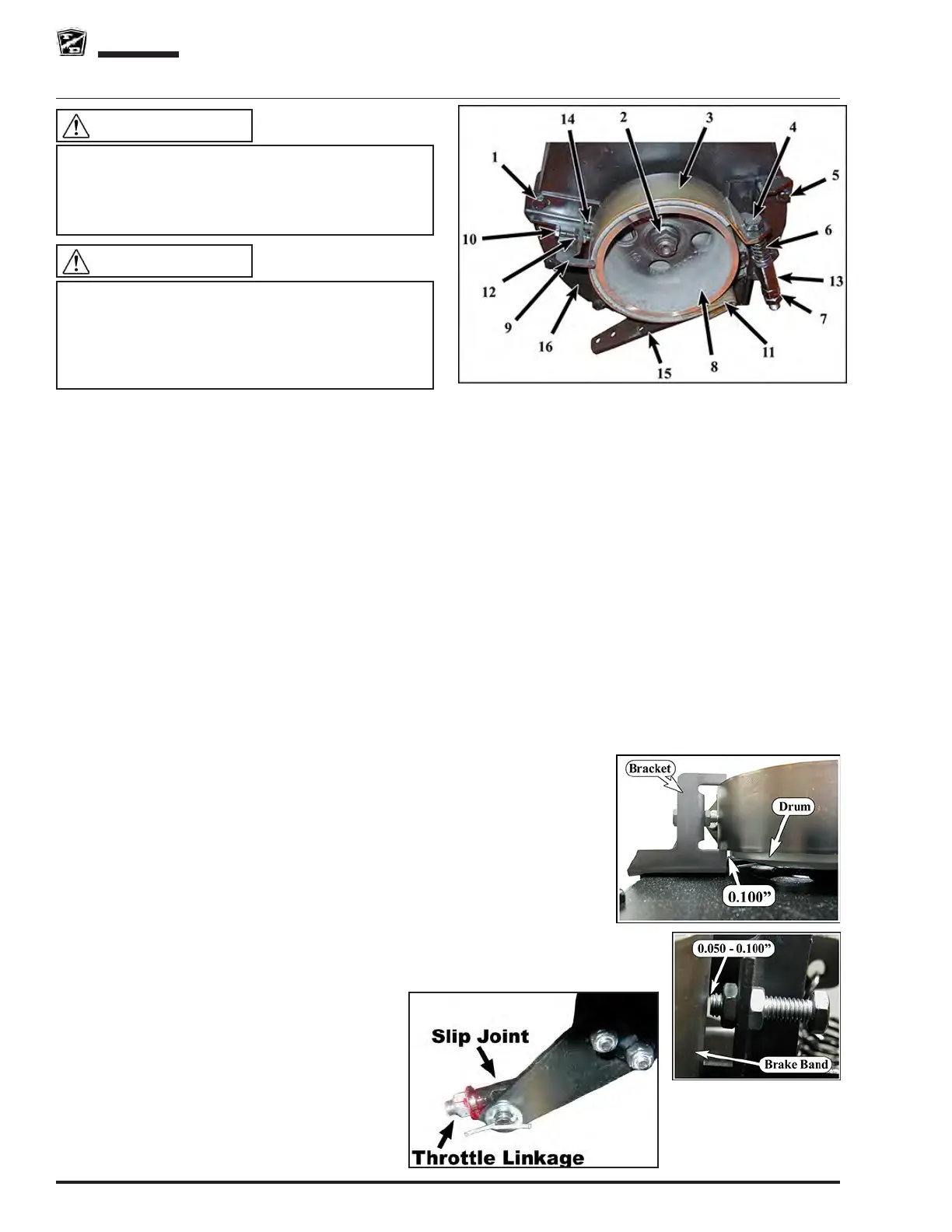 8: Tighten the brake band pivot bolt and then back off just enough so that the brake arm (15) pivots freely.
