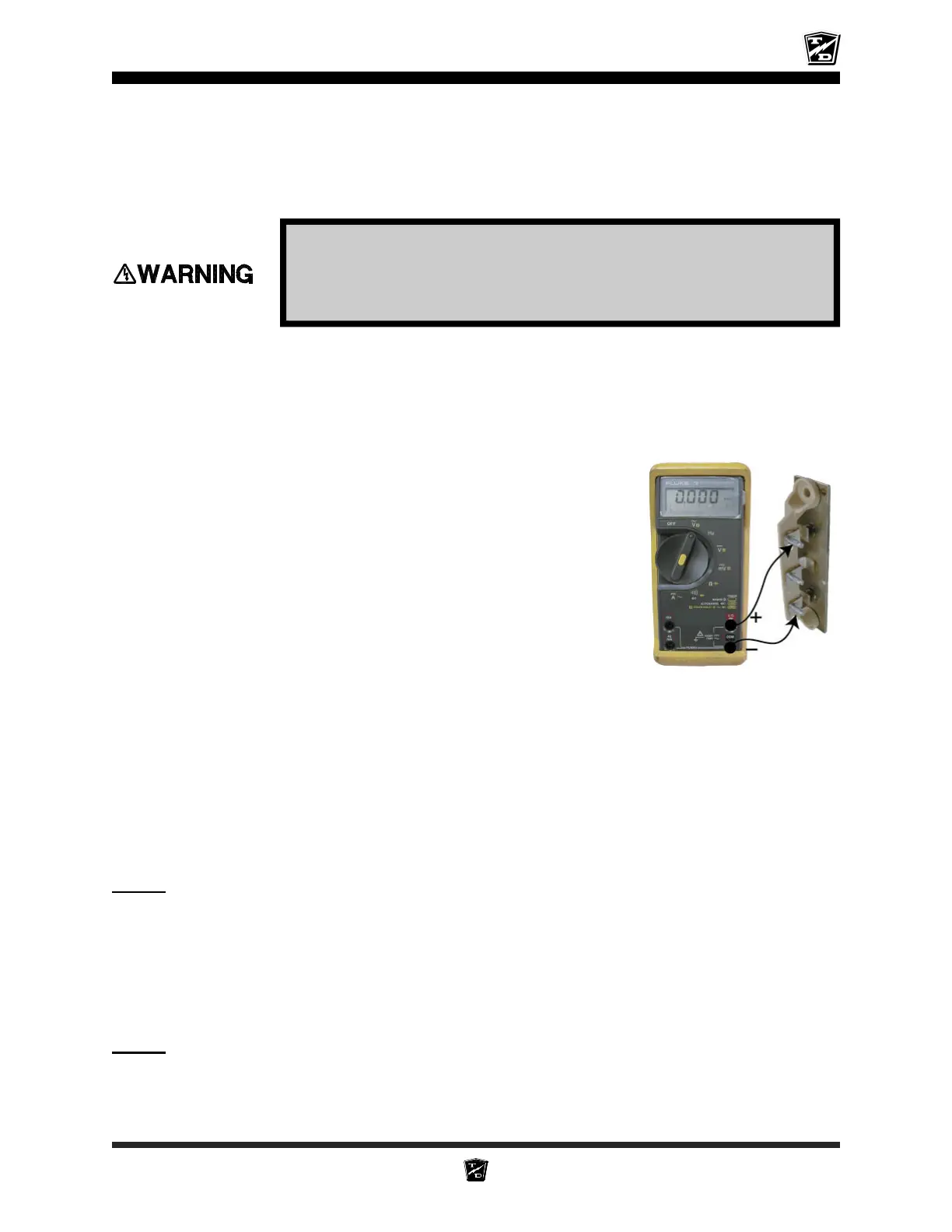 • Test the voltage from the fuse assembly (-) to the diode block (+). This voltage should be equal to the