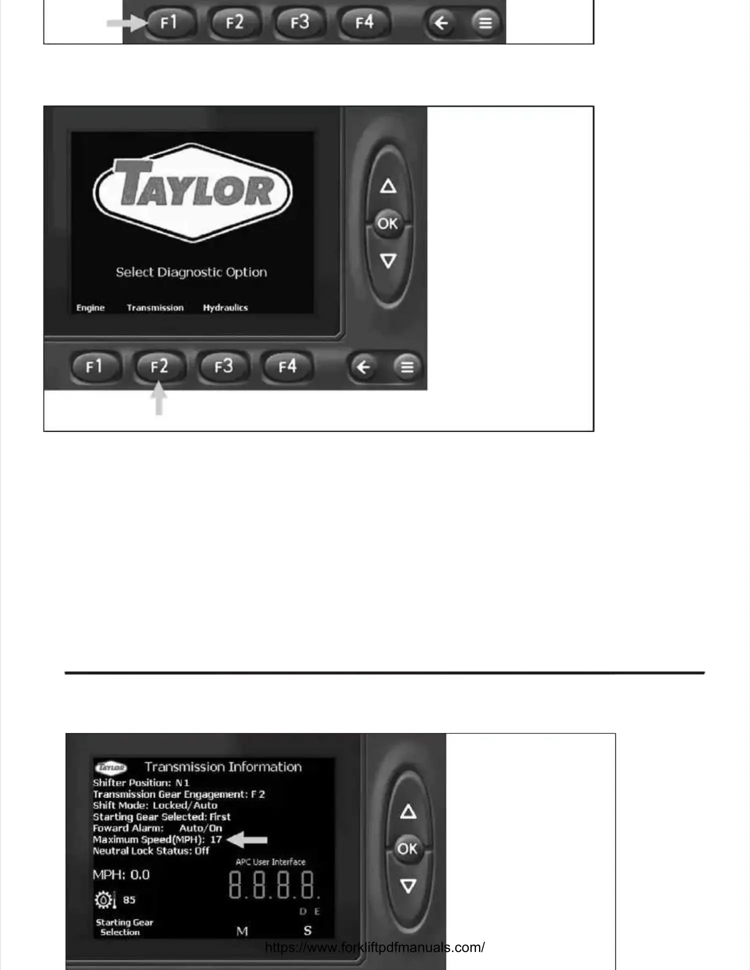 8.8. DepresDepress the F2 butts the F2 button (as indicon (as indicated by arroated by arrow above) to acw above) to access the Tcess the Transmransmissioission Informatin Information screenon screen