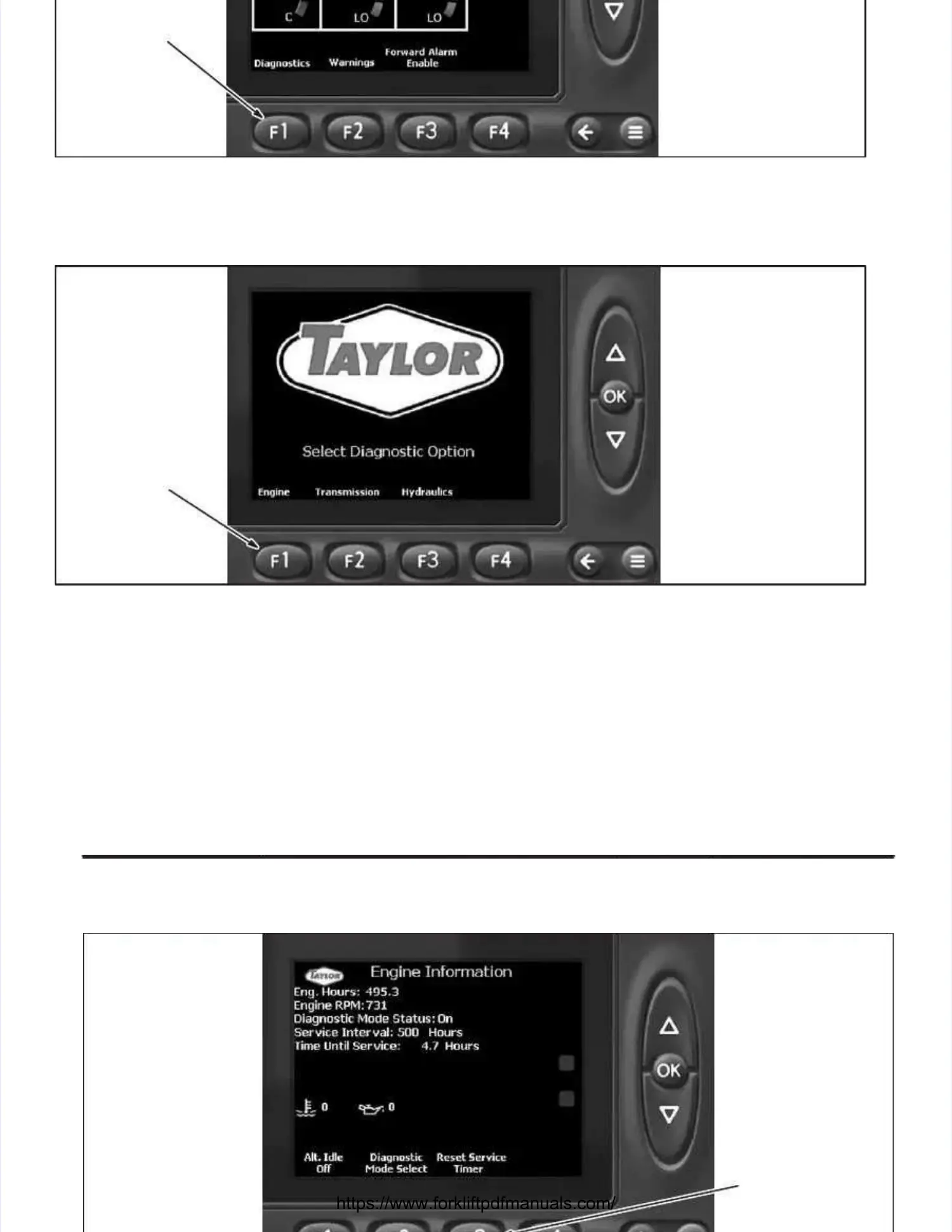 2.2. At the DiagnosAt the Diagnostics Seletics Select screect screen, depress thn, depress the F1 button (Engie F1 button (Engine) to access thne) to access the Engine Infoe Engine Informatiormationn