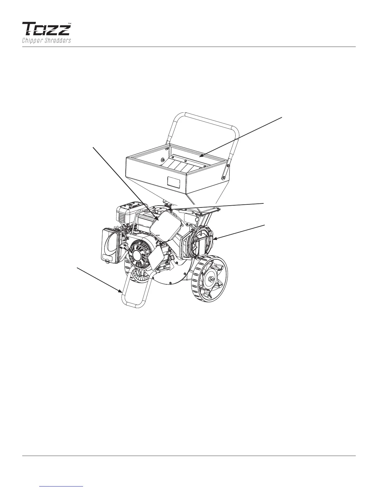 Chipper Cone: The chipper cone is located on the front of the unit next to the engine. Insert branches and tree limbs up to ap-