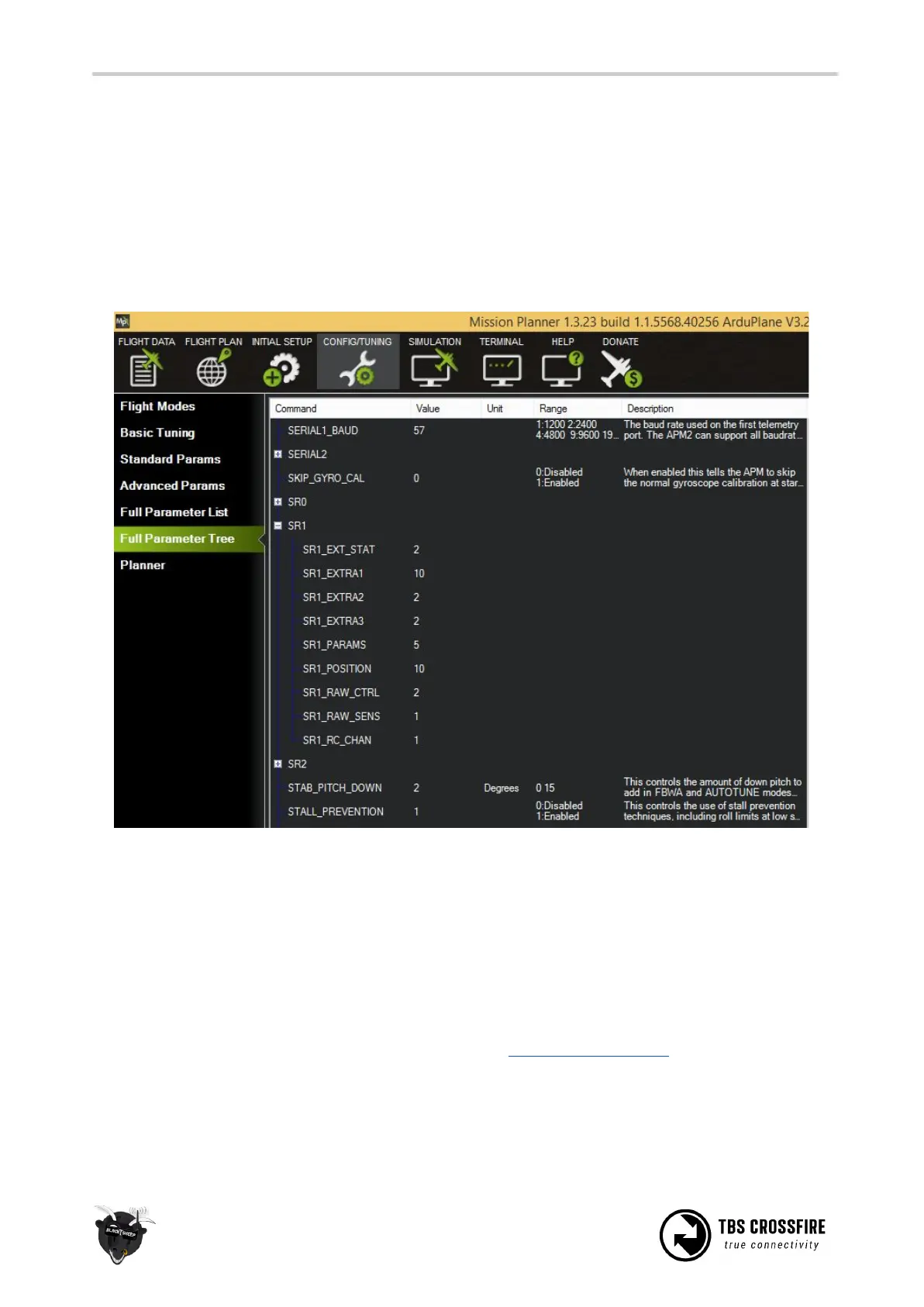Parameter Tree” ‘→ “SR1-SR2”. SR1 stands for telemetry port 1 and SR2 for telemetry port 2. Configure the