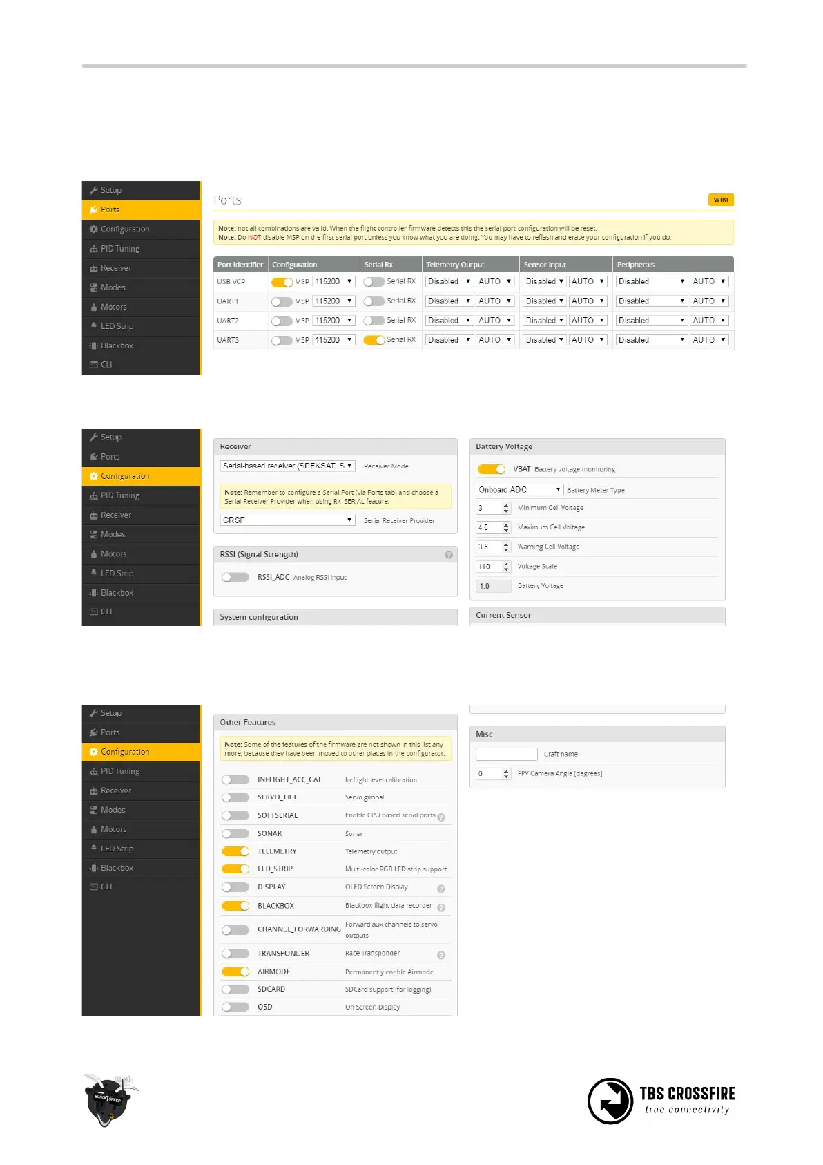 Next, open the “Configurations” and in the “Receiver” section pick “Serial based receiver” and “CRSF”.