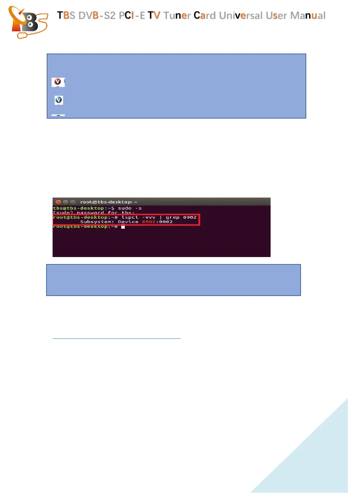 Install your TBS6904se into a PCI-E slot , turn on the PC , run the command “#