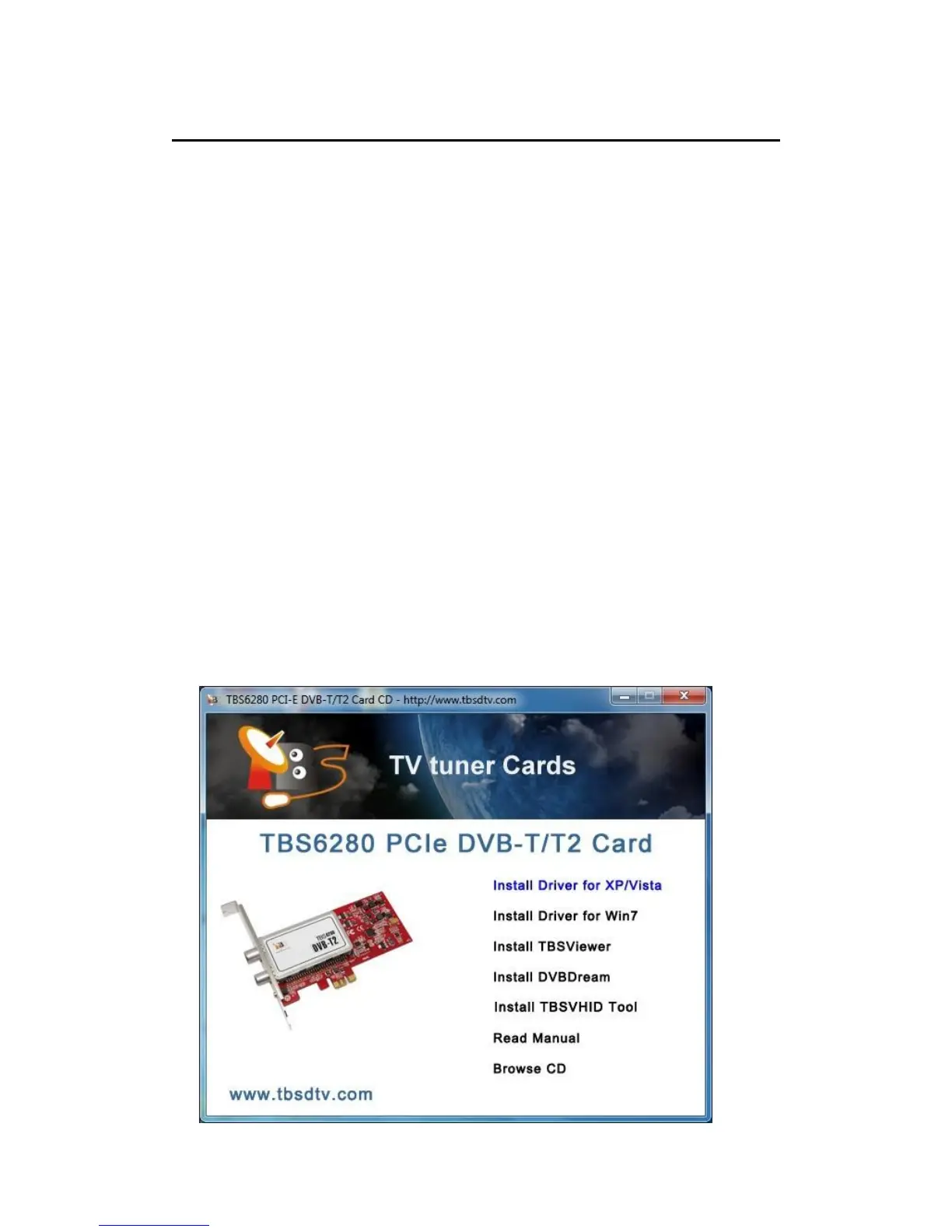 For installing TBS 6280/6220/6284 DVB-T/T2 TV Card, insert the card into PCI