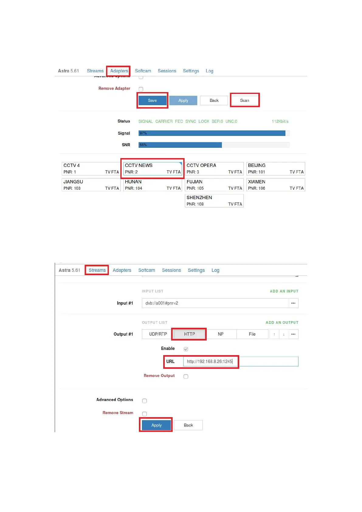 8.6 Log in “Adapters” to scan TV channels, and then select the programs that you