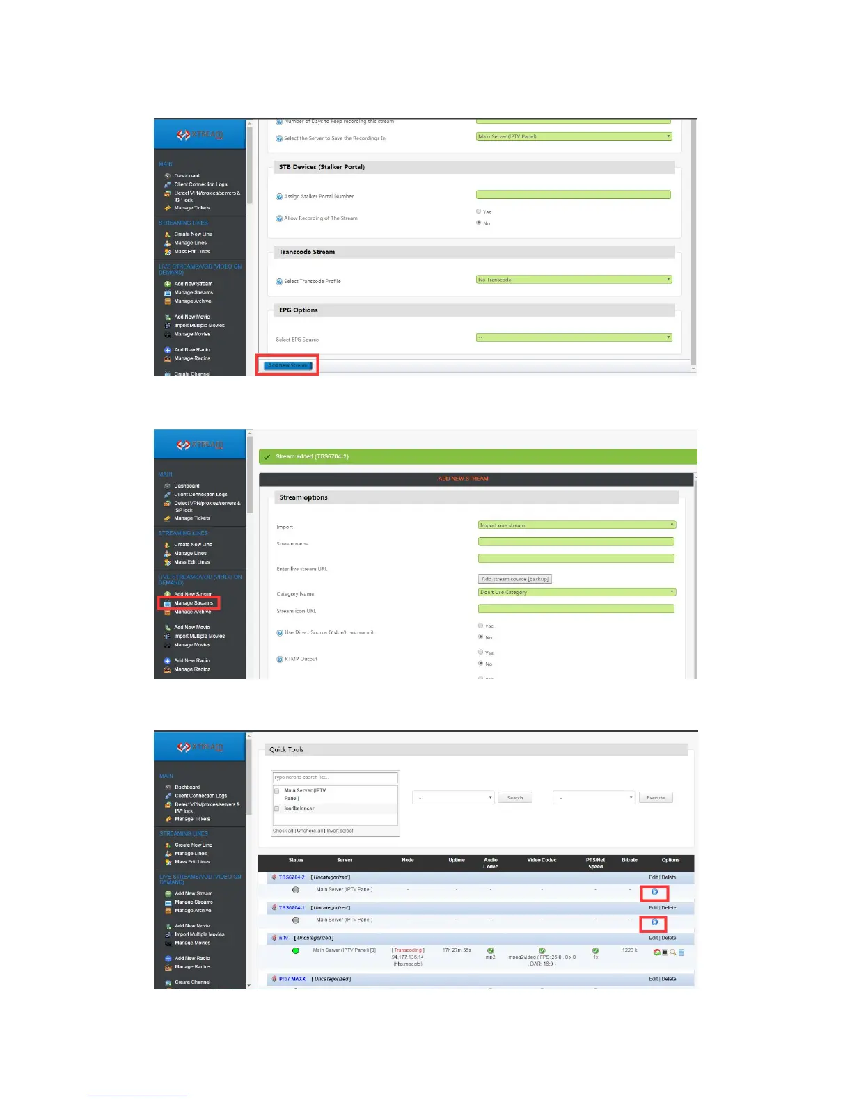 TBS technologies TBS6704 - Configure Recording and Transcoding; Add New Stream; Manage Streams in Quick Tools