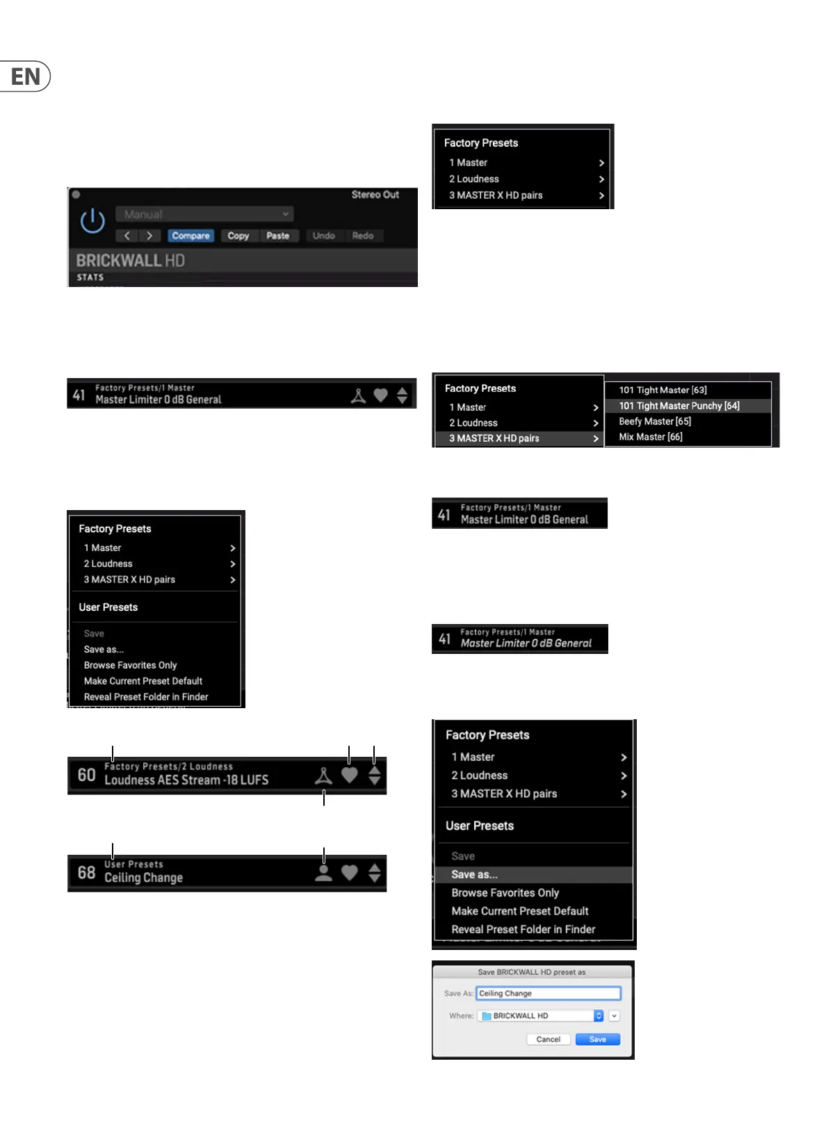 • • Master presets: for when the BRICKWALL is used as with the Master