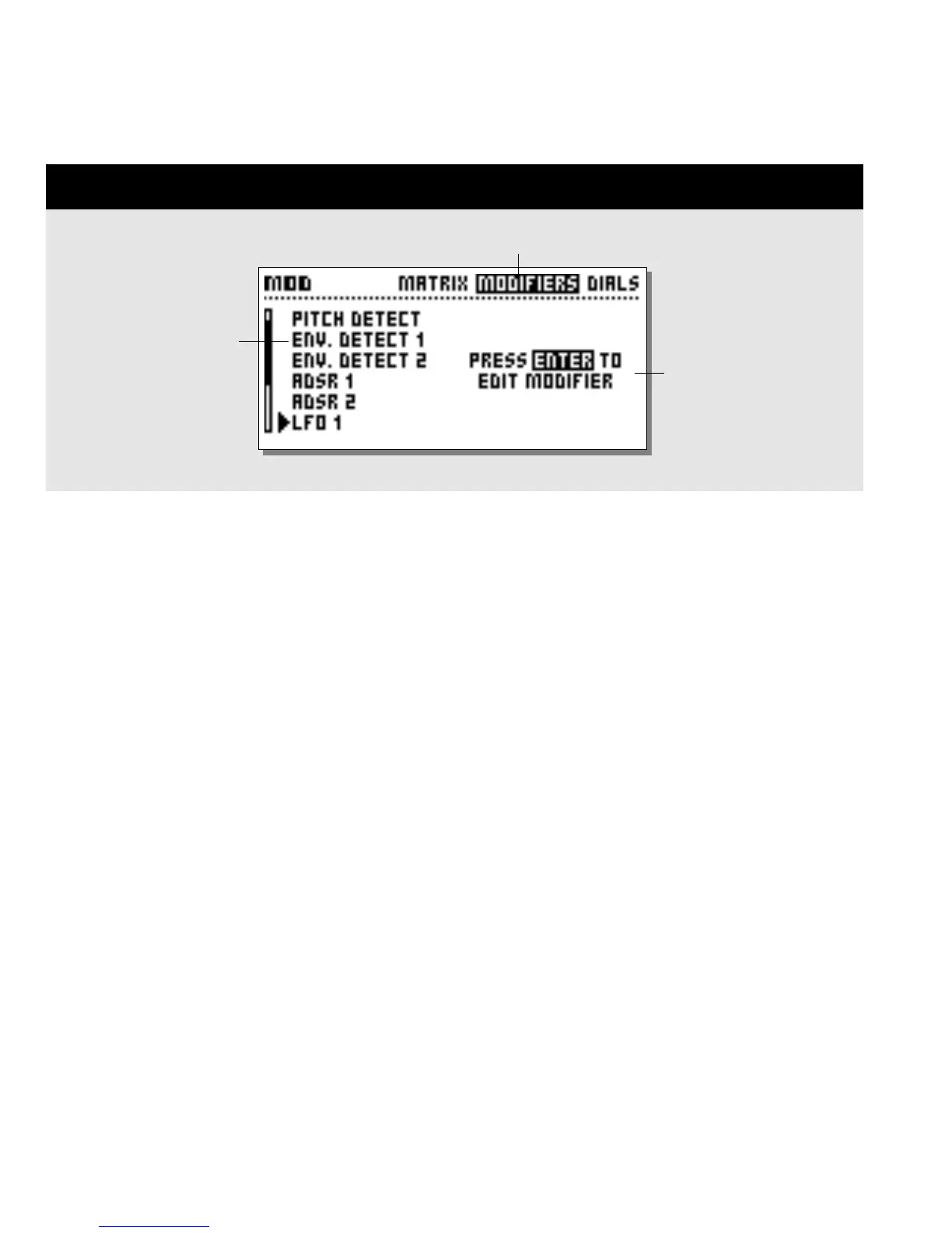 The Modifiers page is where you set up the parameters of the Internal Modifiers. Use the Parameter wheel to select