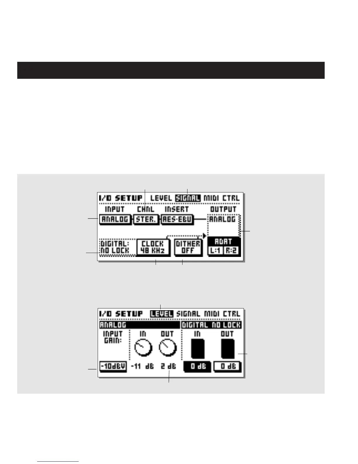 The I/O Setup display contains four pages: MIDI - CTRL - LEVEL- SIGNAL. The four pages contain setups of all the